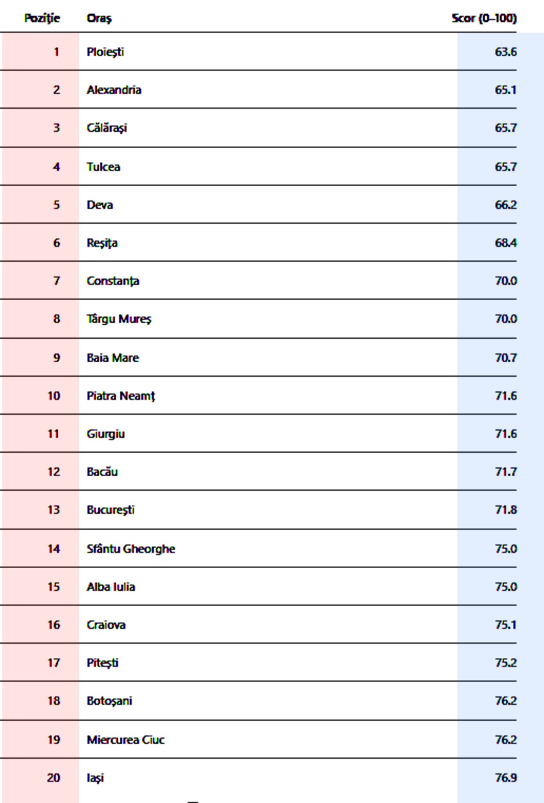 Pe poziții mai bune se află orașe precum Sfântu Gheorghe, Alba Iulia, Craiova, Pitești sau Botoșani, cu scoruri între 75 și 76 de puncte.