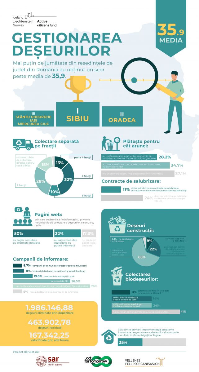 Reședințele de județ din România au fost monitorizate și evaluate pentru prima dată la capitolul gestionarea deșeurilor, în cadrul Raportului național de diagnoză privind calitatea serviciilor publice municipale, realizat de Societatea Academică din România, Asociația Act for Tomorrow șiVellenes Fellesorganisasjon, cu sprijinul financiar Active Citizens Fund România.