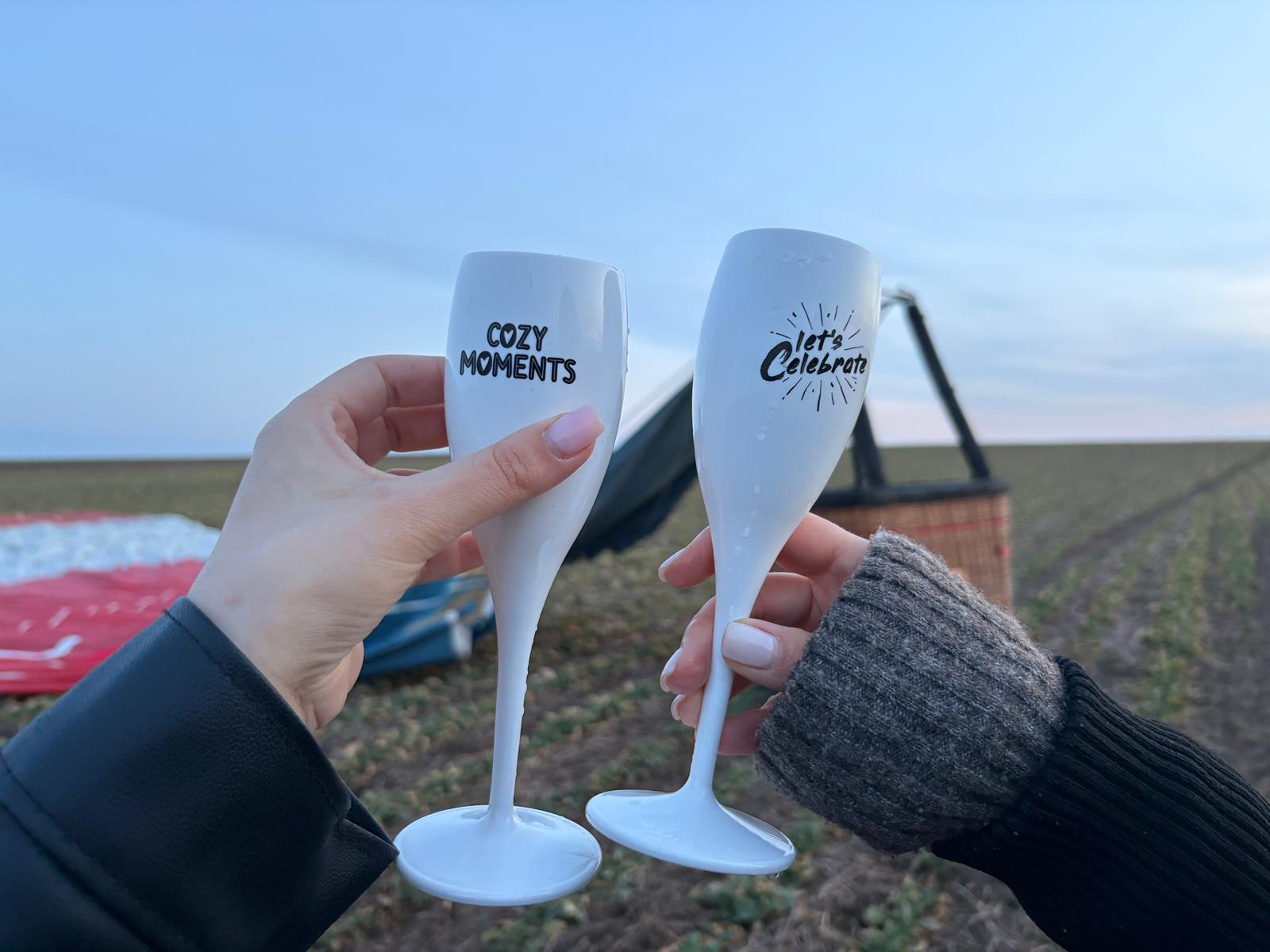 La finalul zborului, tradiția este respectată: o cupă de șampanie pentru a marca momentul.