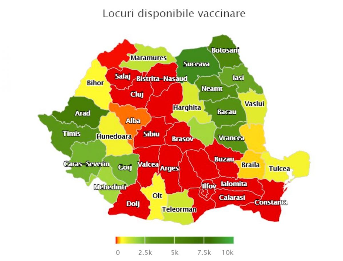 Alte nouă județe indicau sub 1.000 de locuri disponibile pentru vaccinarea anti-COVID: Bihor, Satu Mare, Alba, Hunedoara, Olt, Vaslui, Galați, Brăila și Tulcea.
