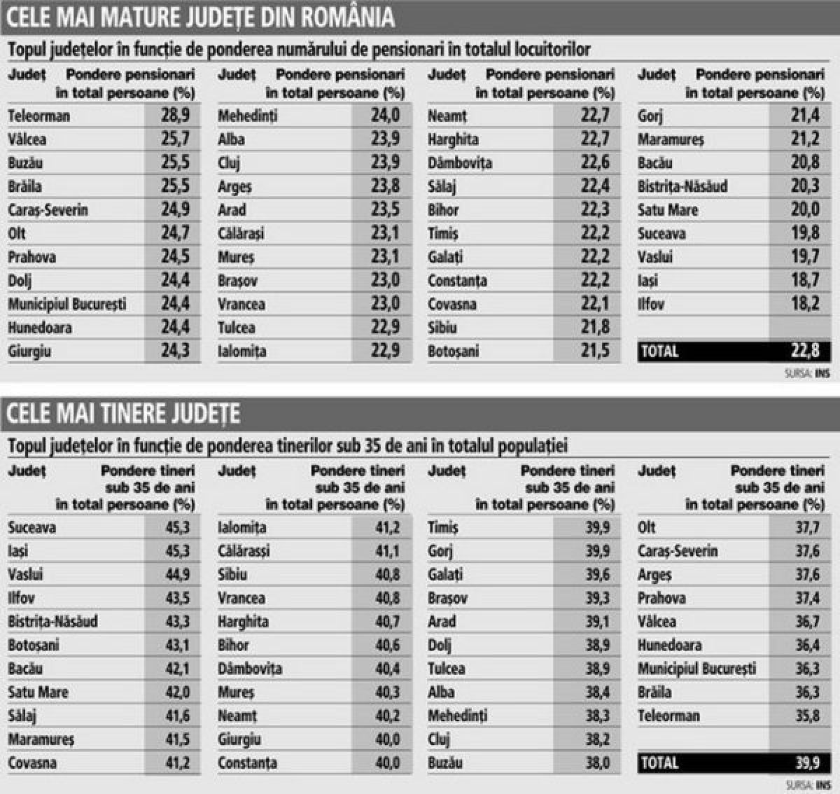 Cele mai tinere județe din România sunt Suceava, Iași, Vaslui, Ilfov, Bistrița-Năsăud şi Botoşani, în funcție de ponderea tinerilor de sub 35 de ani în totalul populației.