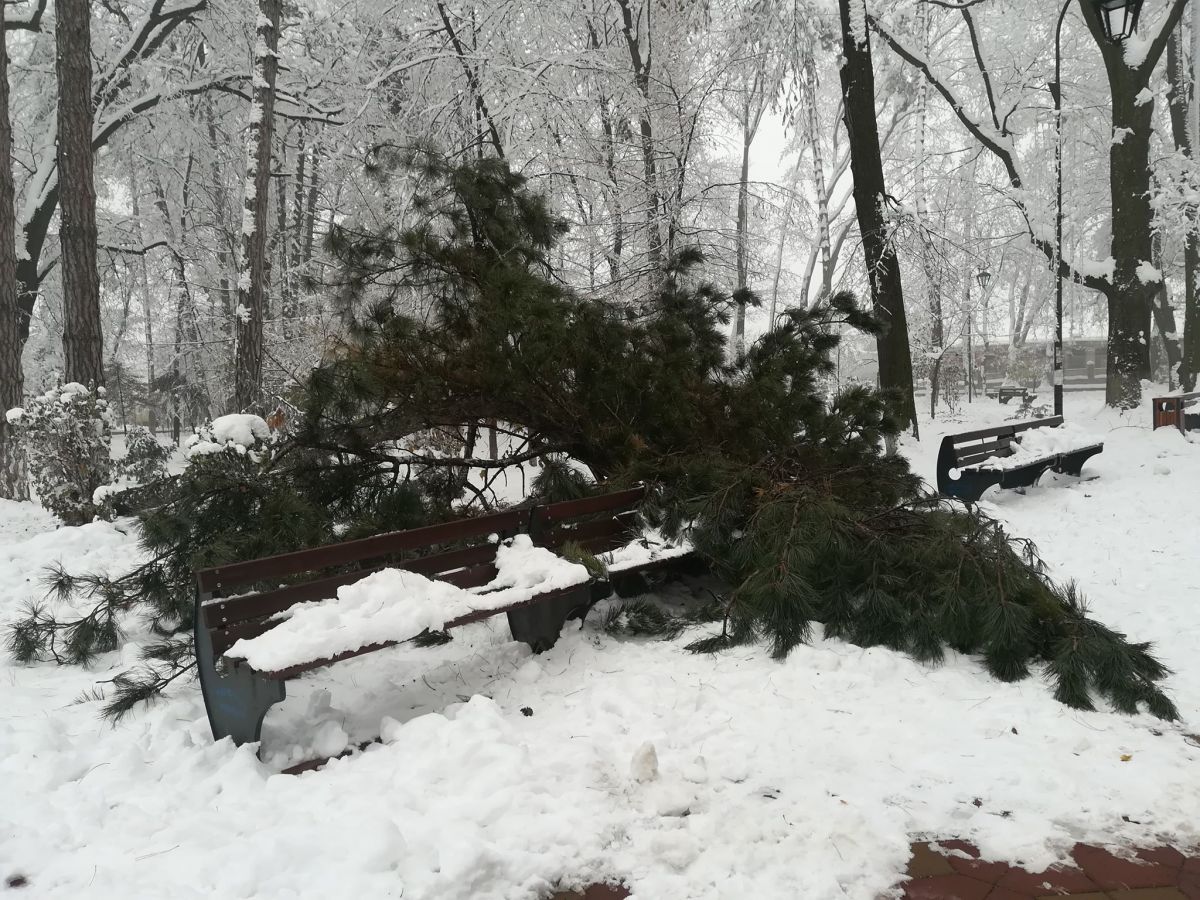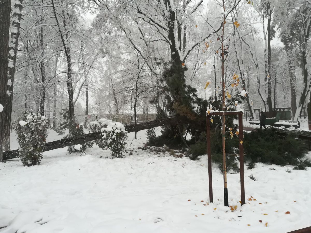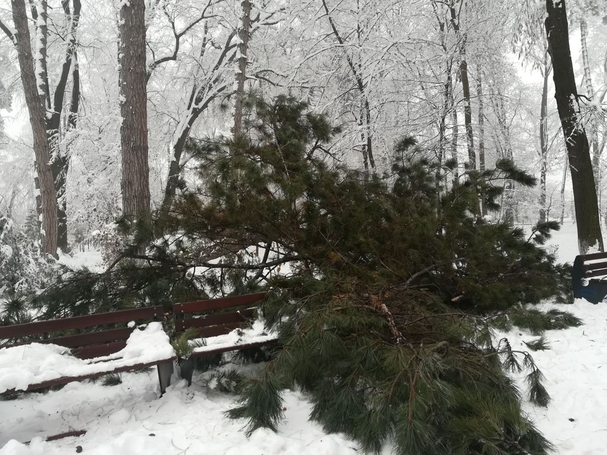 Astăzi, cei care au trecut prin parc au putut observa un brad uriaș care s-a rupt și a căzut peste două bănci. Din fericire, nimeni nu a fost rănit.