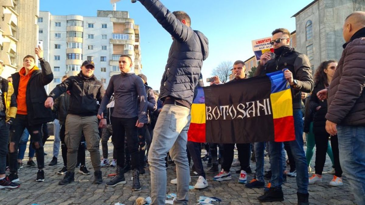 Iar acțiunea de stradă este pe cale să degenereze. Un nucleu format se pare din membrii galeriei FC Botoșani au scandat ”Libertate” și ”La pușcărie, cu toții la pușcărie” și au cântat: ”Noi suntem români, noi suntem pe veci aici stăpâni”.