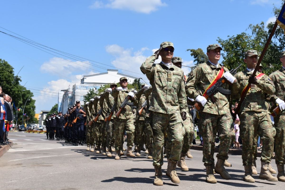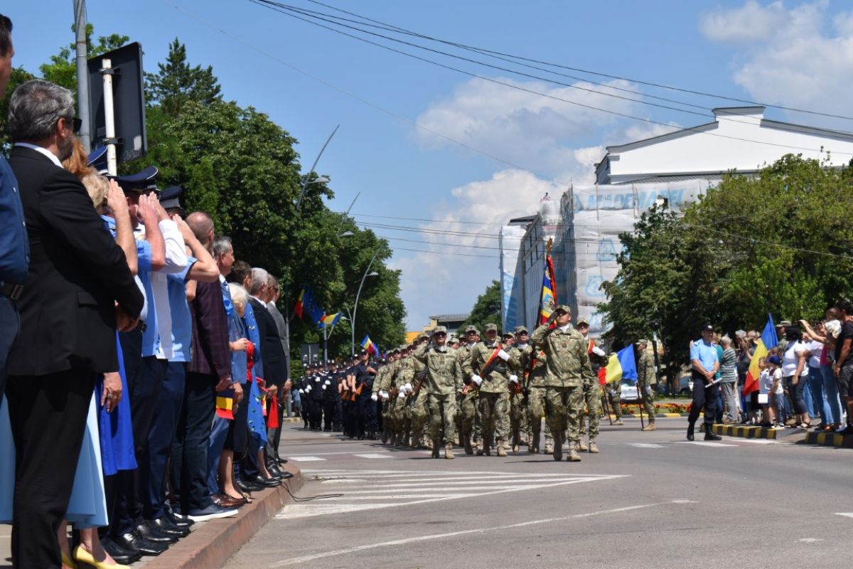 Este vorba despre defilarea militarilor din Garda de Onoare, defilare care se petrece sub privirile oficialităților dar și a botoșănenilor care în general flutură steaguri tricolore.