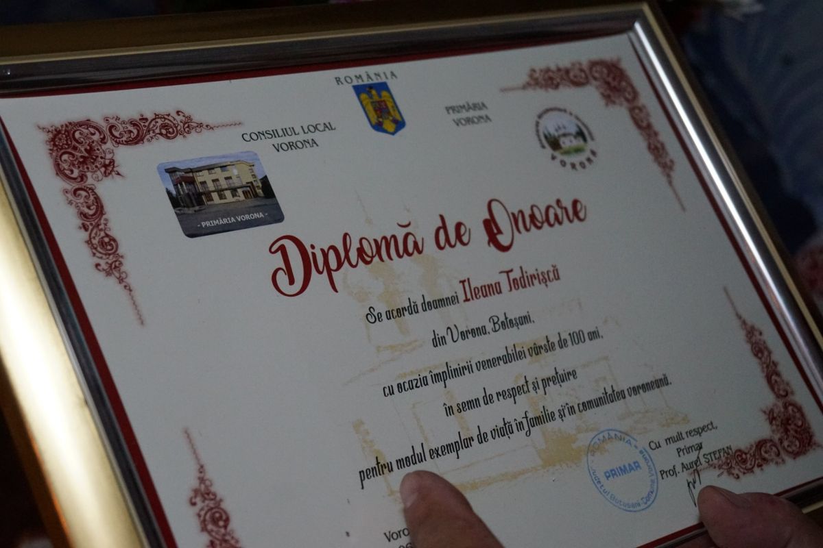 ”Se acordă doamnei Ileana Todirișcă din Vorona, Botoșani, cu ocazia împlinirii venerabilei vârste de 100 de ani, în semn de respect și prețuire pentru modul exemplar de viață în familie și în comunitatea voroneană”, scrie pe Diploma de Onoare primită de bunica Ileana.