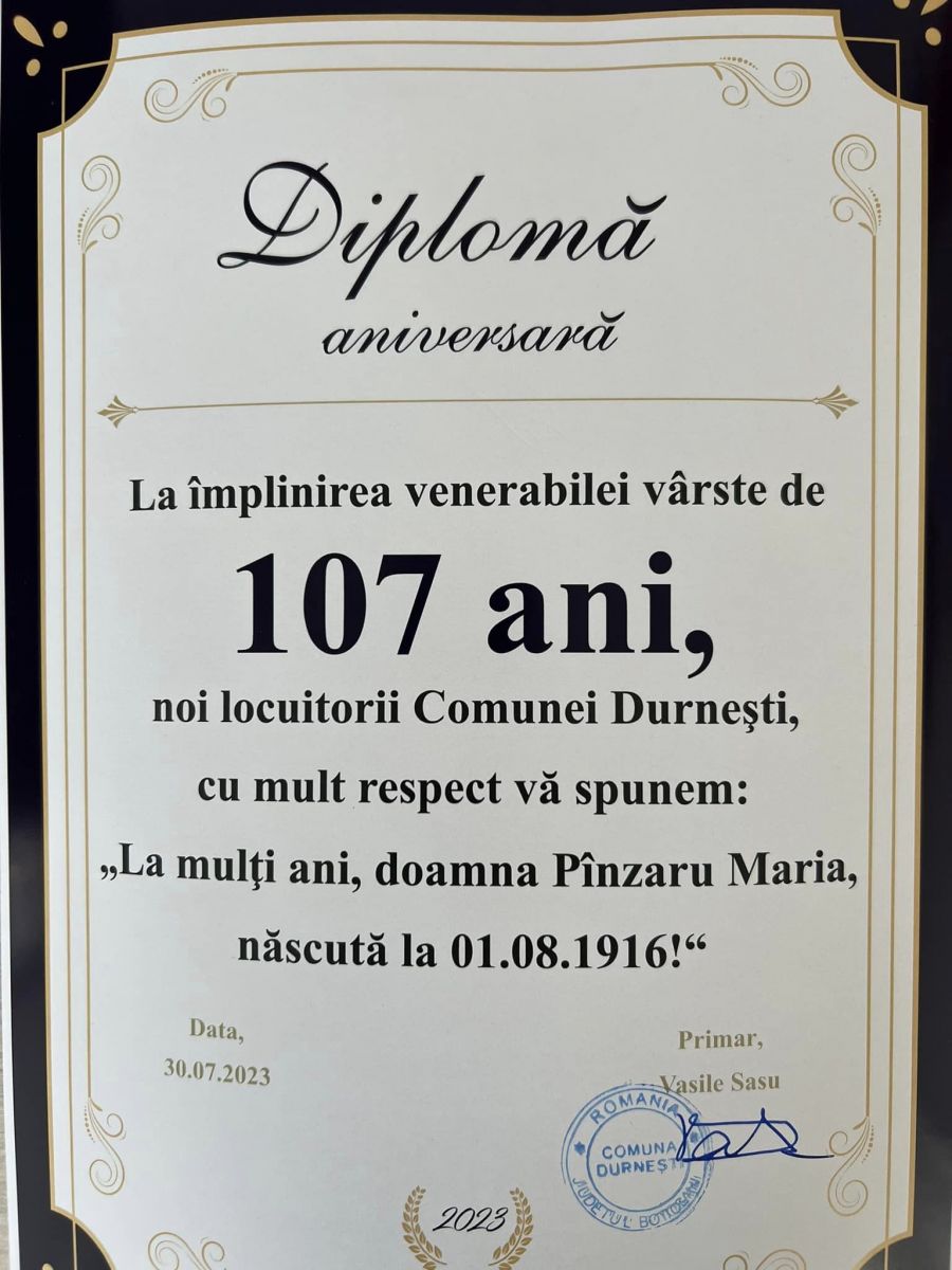 Bunica Maria din Durnești împlinește 107 ani pe 1 august 2023 și a fost sărbătorită în avans de către familie și autoritățile locale.