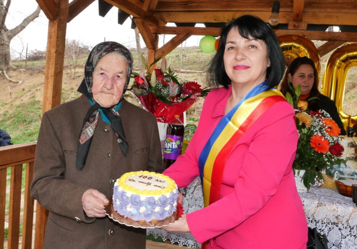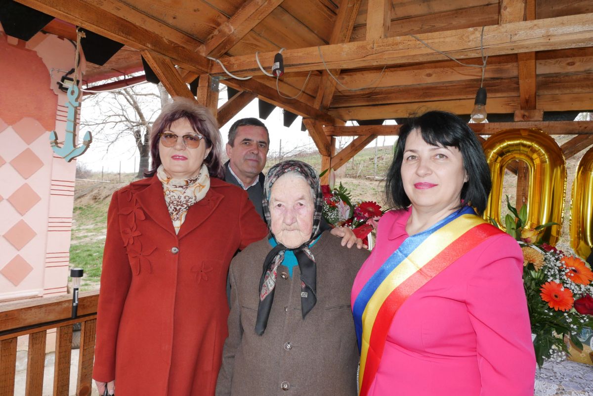 Bunica Maria a fost felicitată de fiul şi fiica ei, de nepoţi, strănepoţi, cât şi de primarul comunei, Daniela Striedie, viceprimarul comunei, Strateanu Gheorghe, secretara primăriei, Mariana Roman, care i-au dăruit bunicuţei un tort, o diplomă, un buchet de flori şi o sumă de bani.