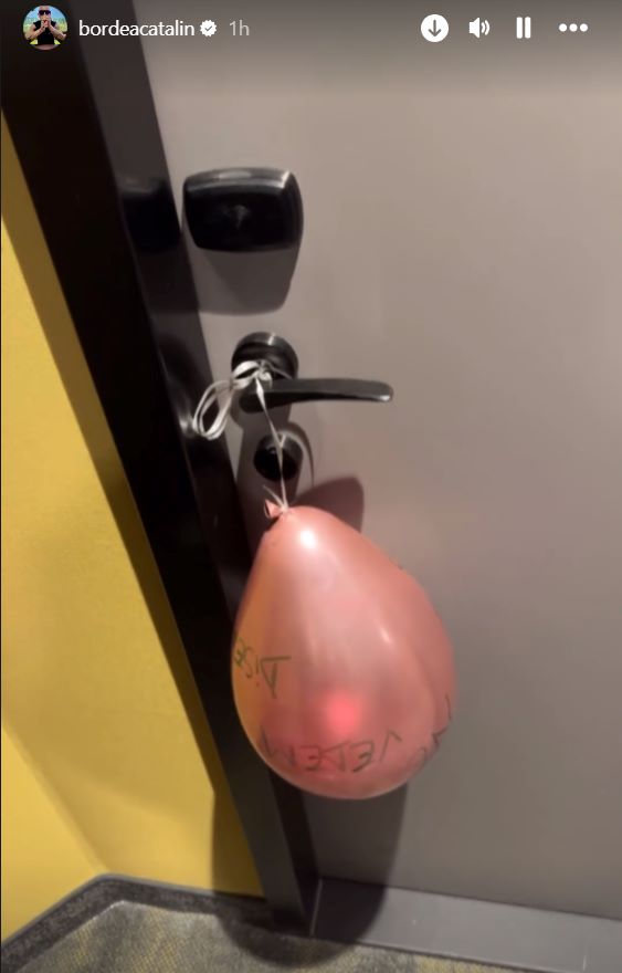 Mai exact, comediantul a găsit un balon roz legat de clanța la ușa camerei sale. Și asta nu este tot! Atunci când s-a uitat mai atent, Cătălin Bordea a observat că persoana care i-a lăsat „cadoul” a scris și un mesaj.