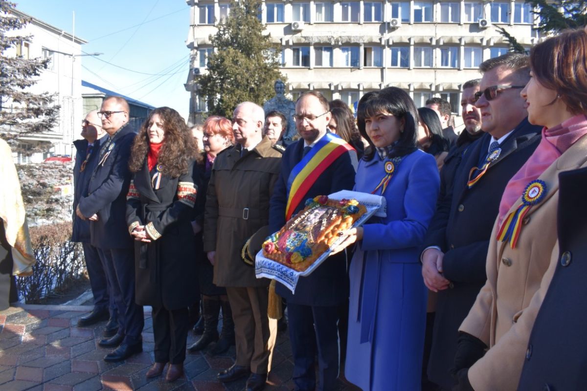 Au săvârșit slujba religioasă iar spre final, părintele Petru Chirvase a luat de pe masă o coptură specială cu însemnele tricolore și cu imaginea domnitorului Cuza.