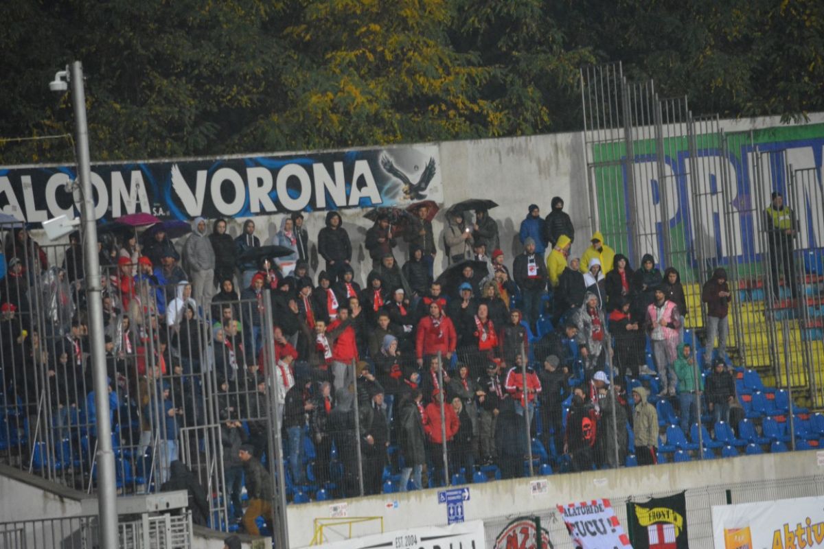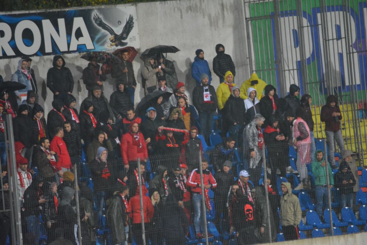 Când vreo 10 minute înaintea fluierului de start, roş-alb-albaştrii au o galerie formată din vreo 30 de membri.