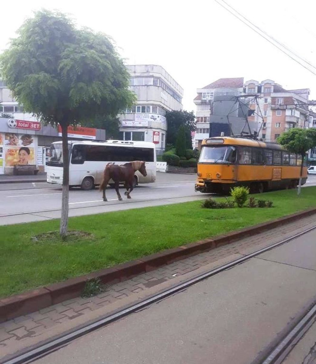 Animalul pierdut de stăpân umbla liber, marţi dimineaţă, în jurul orei 8.40, pe Calea Naţională, vis-a-vis de Direcţia de Taxe si Impozite Locale. Calul a luat „la pas” orașul, de parcă nu s-ar simți deranjat deloc de traficul din zonă.