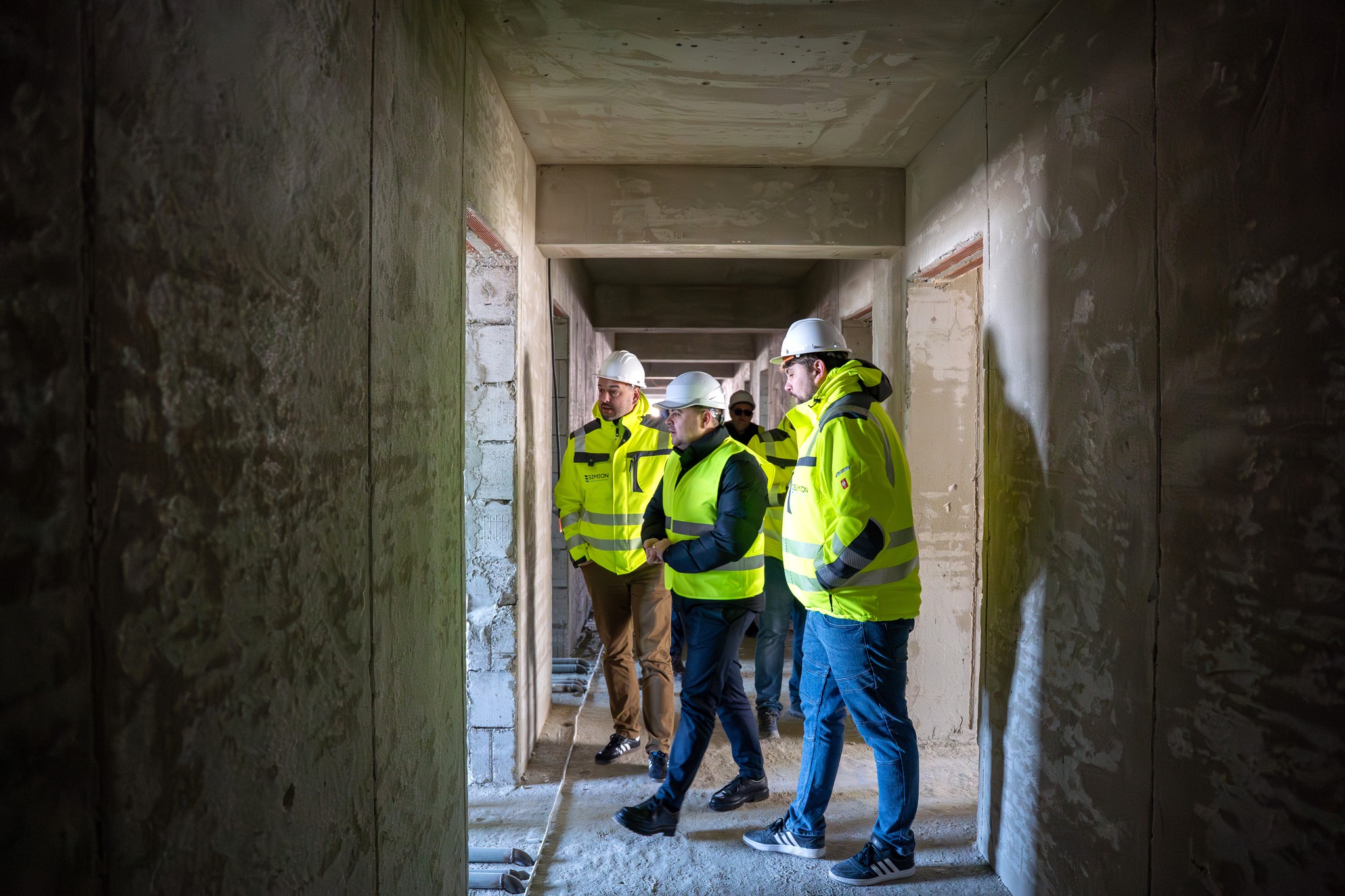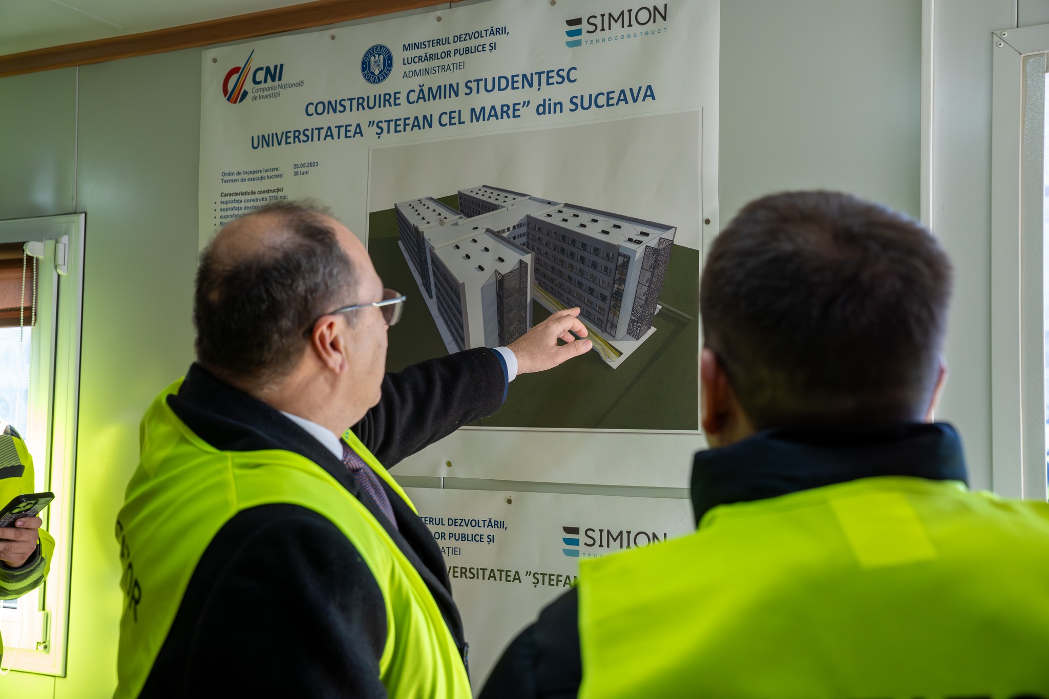 În cadrul întâlnirii de ieri cu reprezentanții USV, președintele Consiliului Județean a vizitat și șantierul căminului studențesc, care va oferi peste 400 de camere și 824 de locuri de cazare, incluzând camere adaptate pentru persoanele cu dizabilități, săli de mese, spălătorii profesionale, lifturi și săli de lectură.