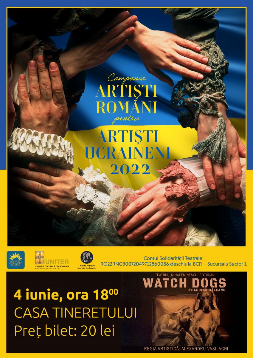 Teatrul „Mihai Eminescu” din Botoșani, sub patronatul UNITER, vă invită sâmbătă, 4 iunie 2022, de la orele 18.00, în incinta Casei Tineretului, la spectacolul „Watch dogs”, de Lucian Băleanu, în regia lui Alexandru Vasilachi, scenografia Mihai Pastramagiu, cu actorii Gina Pătrașcu Zamfirache, Gheorghe Frunză, Răzvan Amitraoaei și Sorin Ciofu.