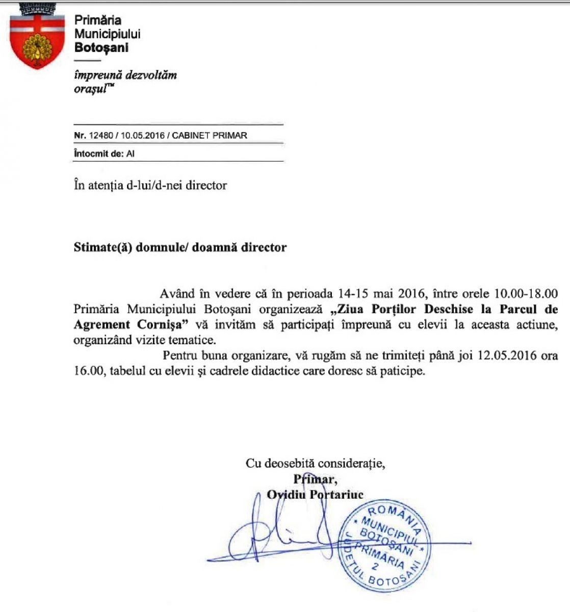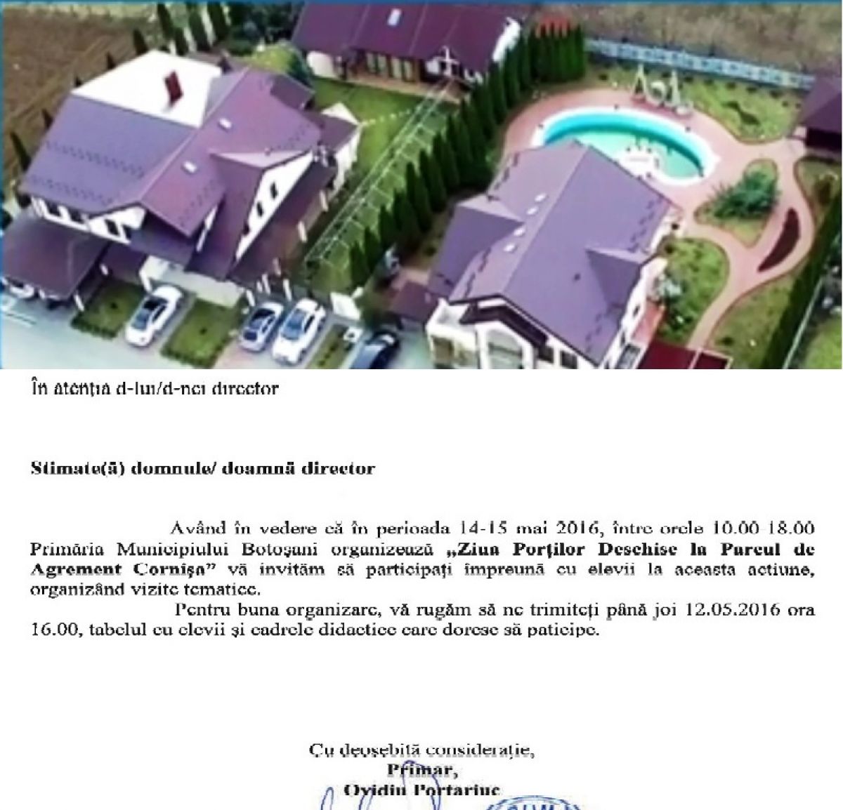 De cealaltă parte, a ieșit la iveală o adresă pe care Primăria Botoșani a trimis-o școlilor, care îi aparține chiar lui Ovidiu Portariuc și prin care se recomandă directorilor unităților de învățământ să își ducă elevii la Parcul de Agrement Cornișa. În adresă se menționează că municipalitatea organizează Ziua Porților Deschise, iar până astăzi trebuiau trimise instituției tabelele cu elevii și cadrele didactice care doresc să ia parte la eveniment. (S.B.)