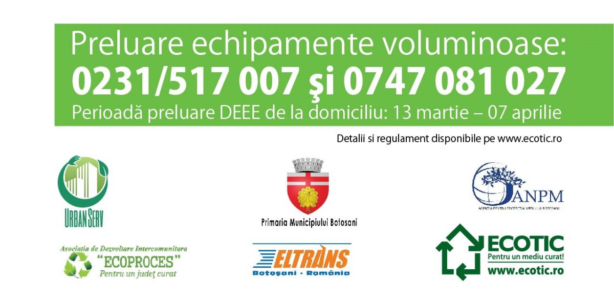 ECOTIC, alături de partenerii săi Urban Serv SA, Primăria Municipiului Botoșani, APM Botoșani, Asociația de Dezvoltare Intercomunitară Ecoproces și Eltrans Botoșani organizează o campanie de colectare deșeuri de echipamente electrice și electronice în Botoșani.