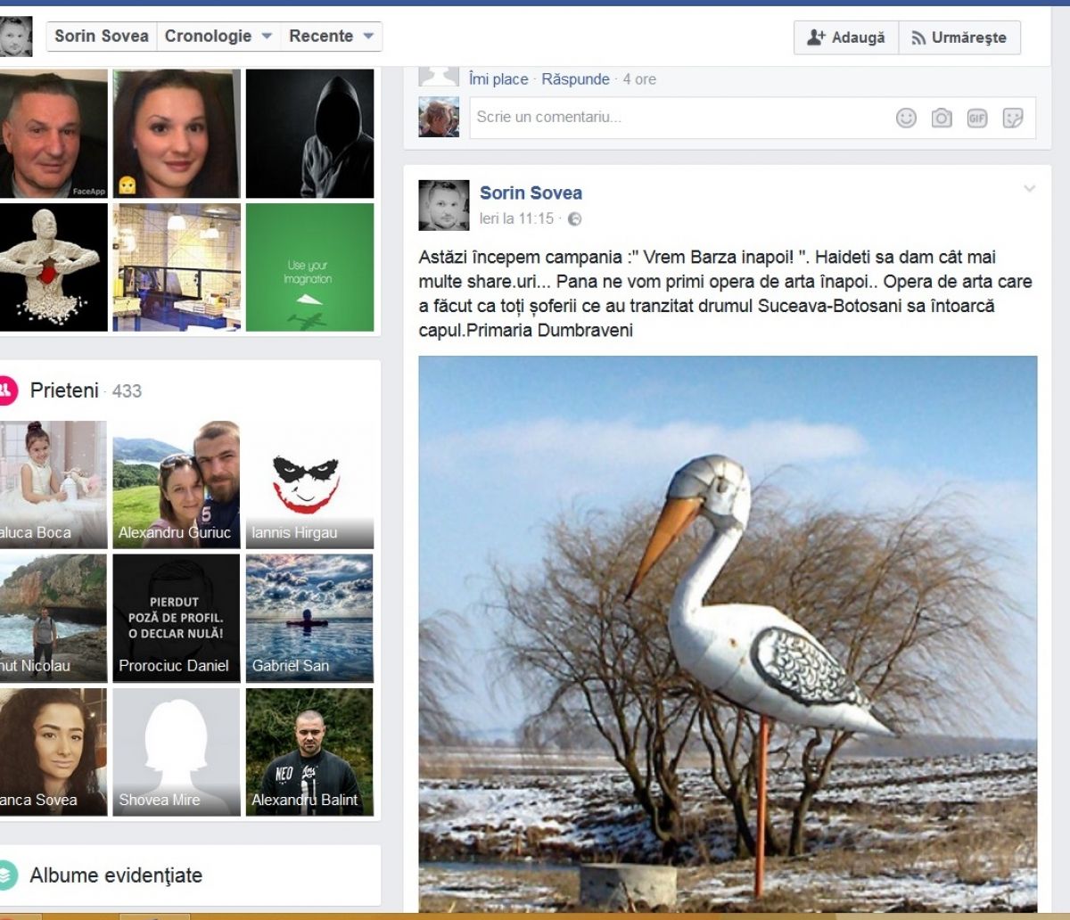 ”Astăzi începem campania :" Vrem Barza inapoi! ". Haideti sa dam cât mai multe share.uri... Pana ne vom primi opera de arta înapoi.. Opera de arta care a făcut ca toți șoferii ce au tranzitat drumul Suceava - Botosani sa întoarcă capul. Primaria Dumbraveni”.