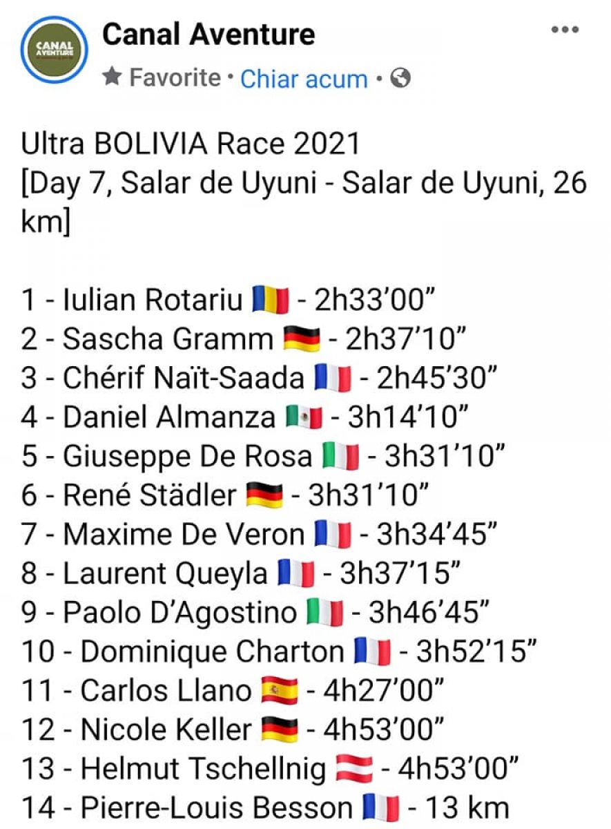 Ultramatatonul Ultra Bolivia Race s-a desfășurat în perioada 20 - 26 septembrie și a aliniat la start 14 dintre cei mai buni alergători de ultramaraton extrem din lume. Doar 13 au reușit să termine cursa.