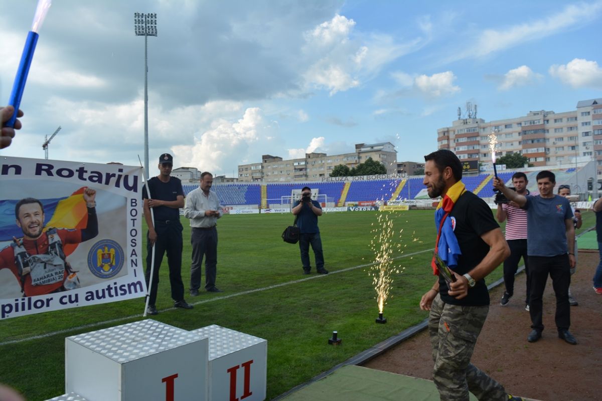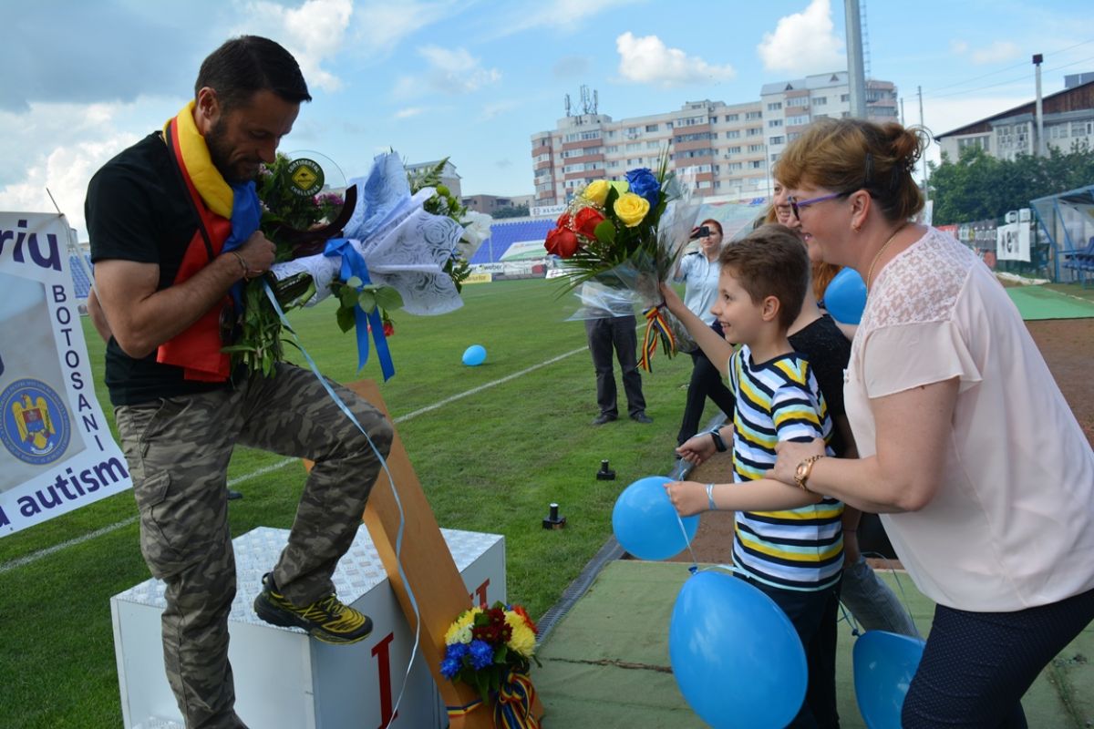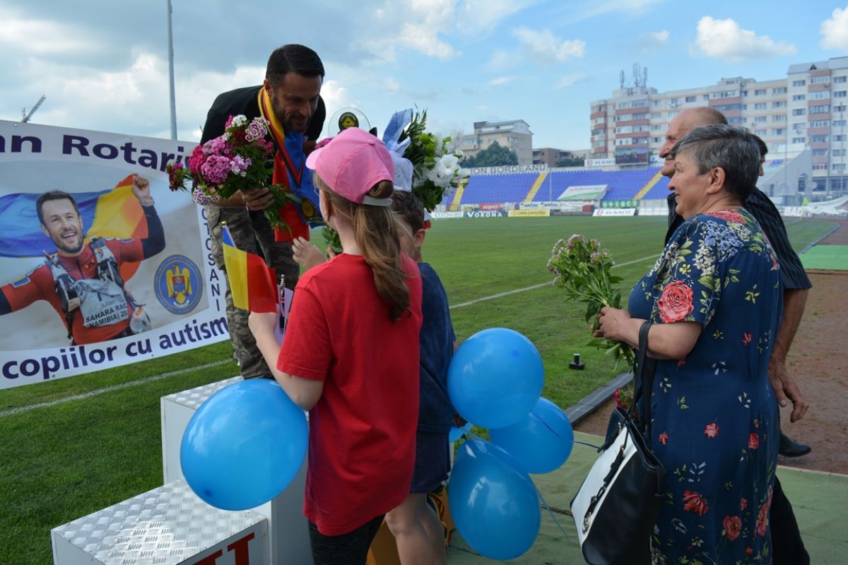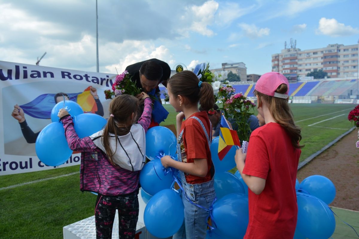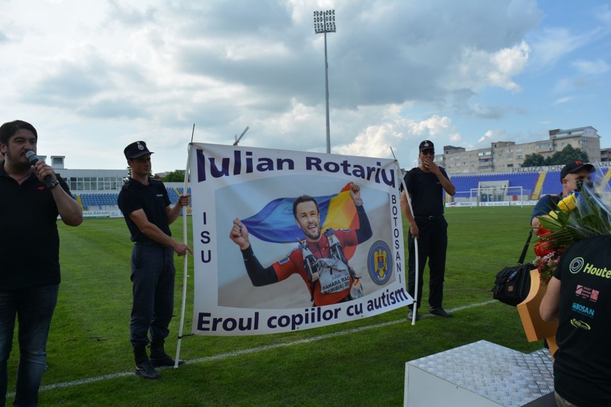 Iulian Rotariu a venit pe pista de atletism, iar pe gazon și în tribune a fost așteptat de oficialități ale județului și orașului, de șefii și colegii de la ISU Botoșani, de părinții săi, de soția Claudia și cei doi copii, Maria și David.