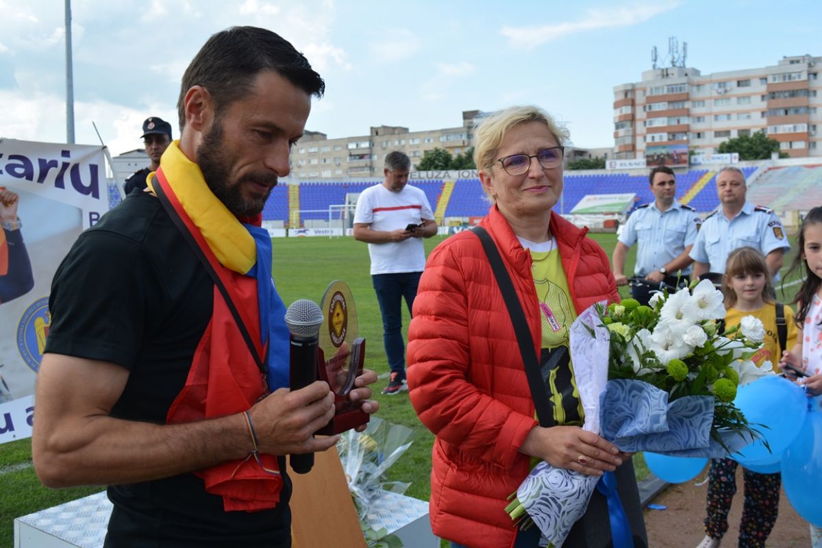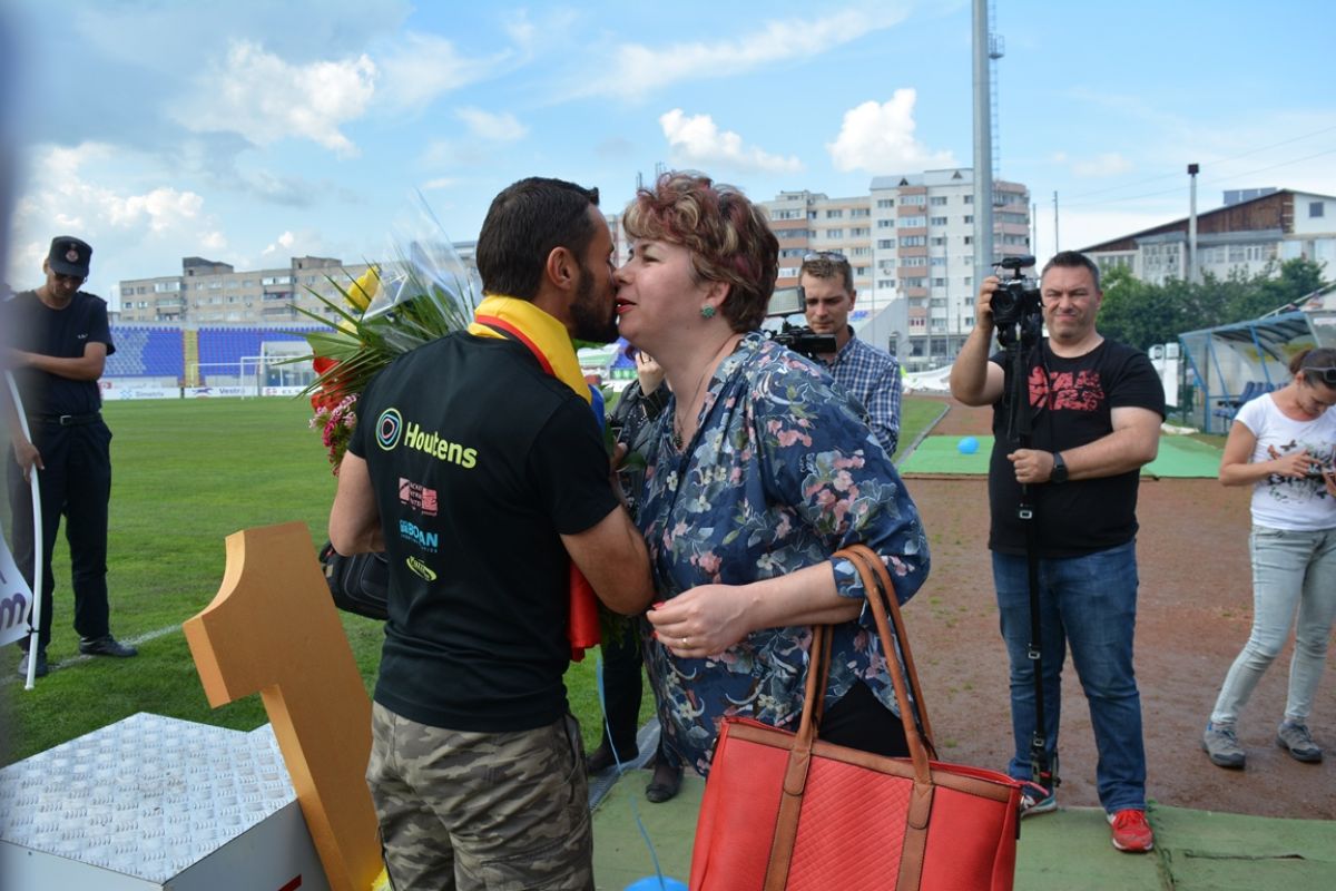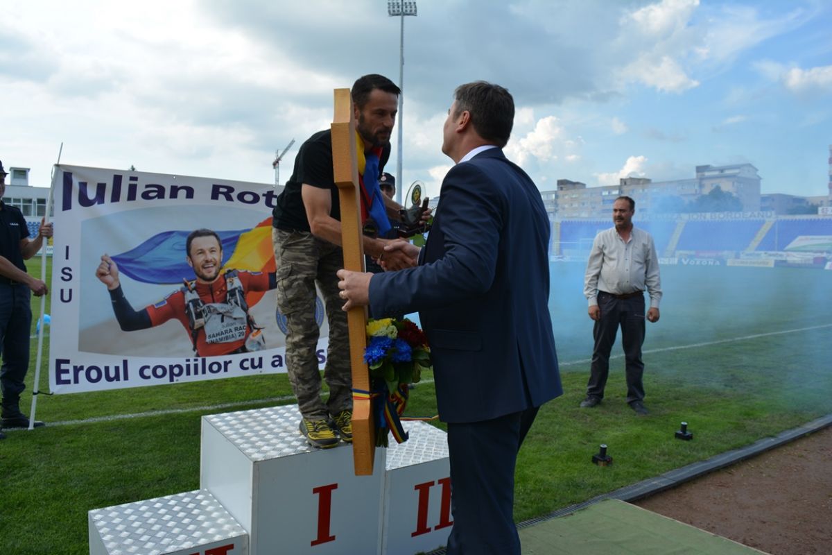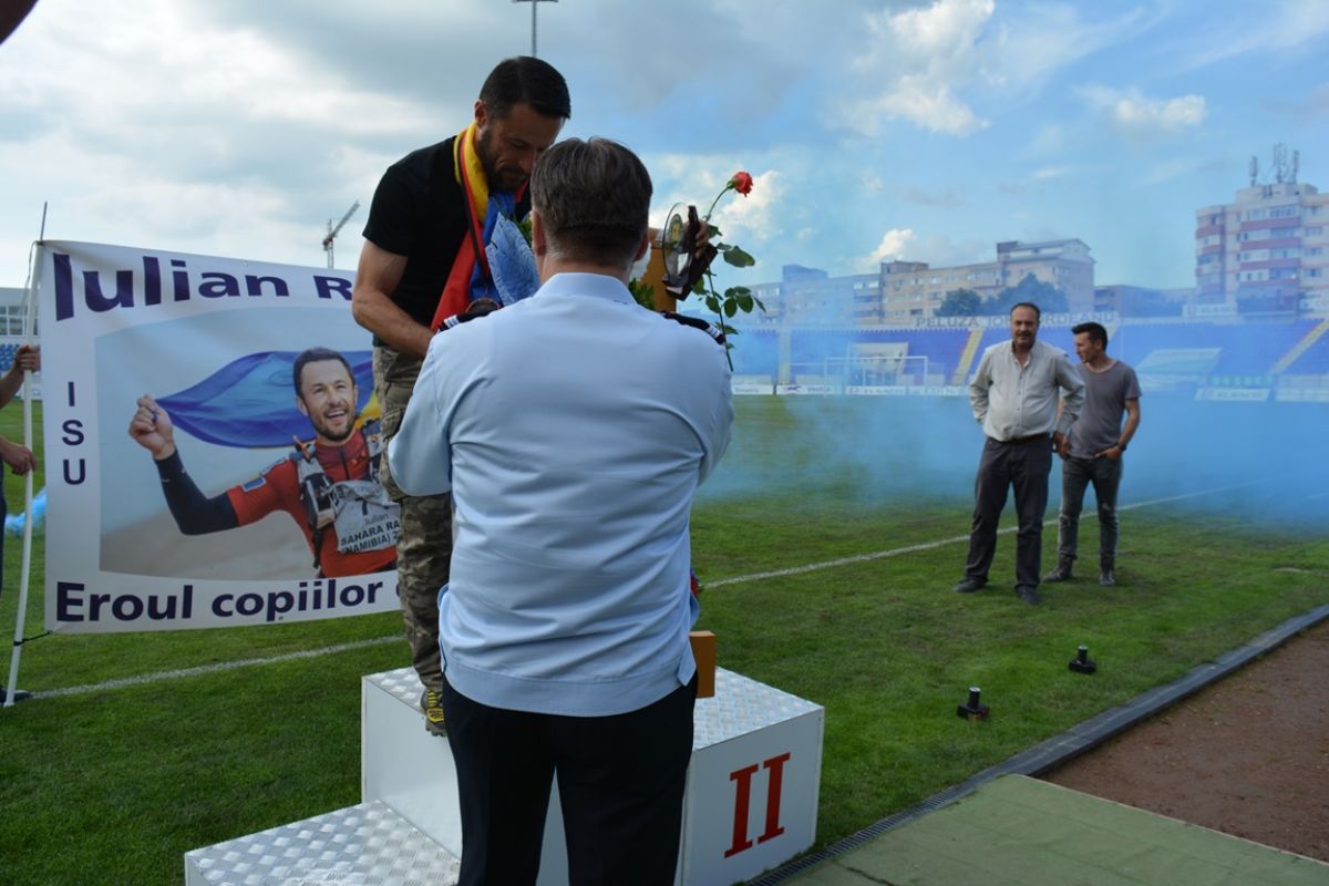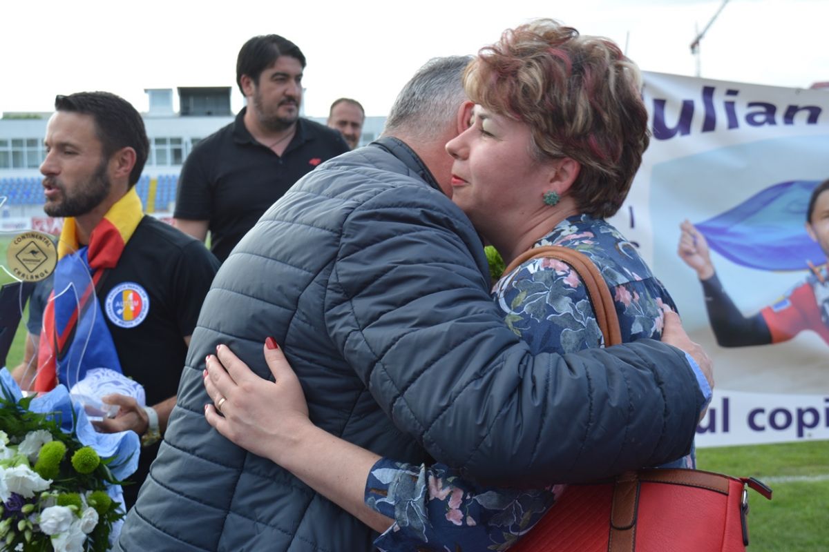Iulian Rotariu a venit pe pista de atletism, iar pe gazon și în tribune a fost așteptat de oficialități ale județului și orașului, de șefii și colegii de la ISU Botoșani, de părinții săi, de soția Claudia și cei doi copii, Maria și David.