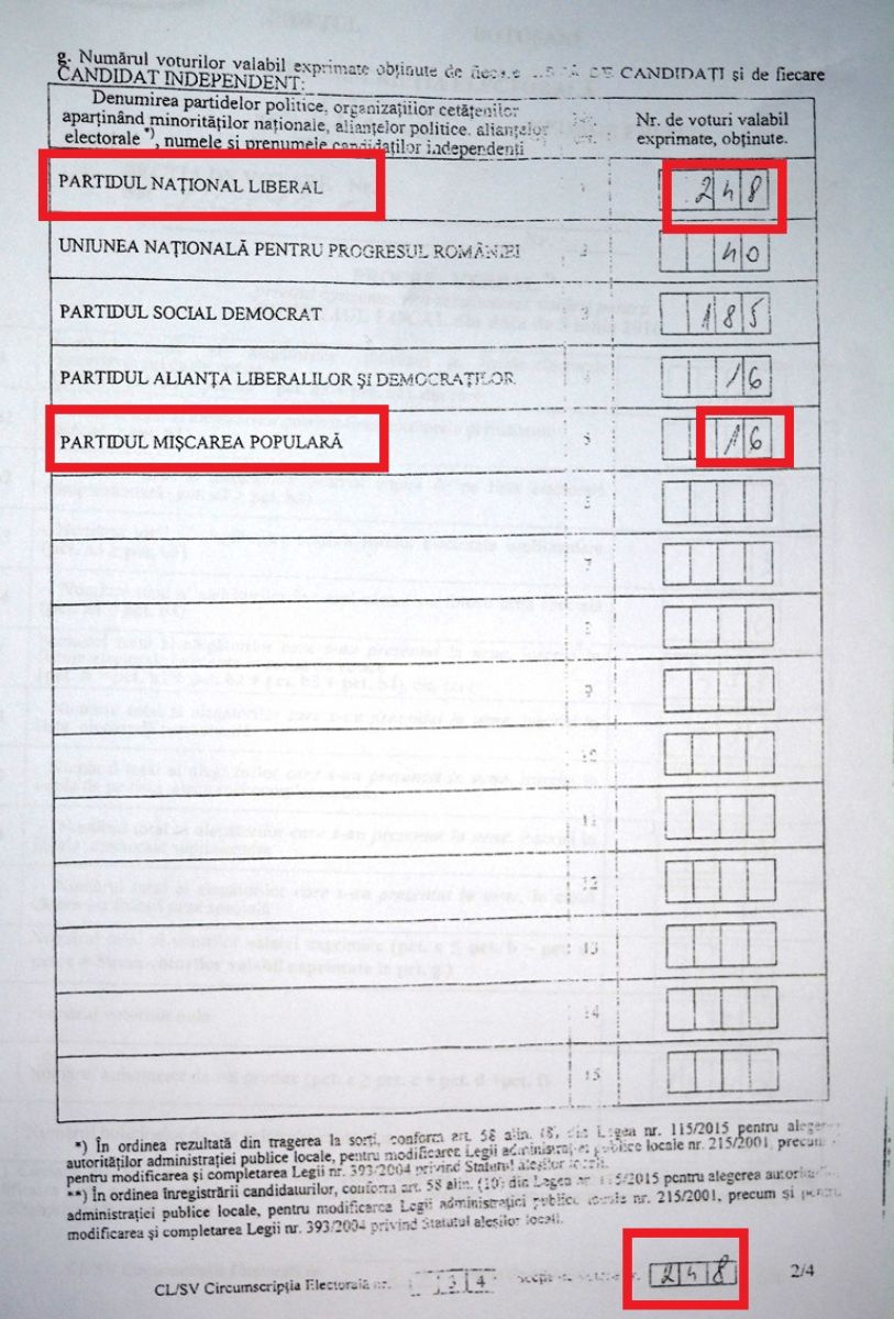 În condiții încă neelucidate, la Biroul Electoral de Circumscripție George Enescu a apărut însă un alt proces verbal, în care PNL-ul mai avea doar 248 de voturi, iar PMP 16. Urmare a acestei manevre PMP, care nu întrunea numărul necesar de voturi pentru a face pragul electoral, l-a făcut și a câștigat un mandat de consilier local, care, în condițiile în care procesul-verbal nu se modifica, mergea la ALDE, care ar fi avut doi consilieri și nu unu singur.