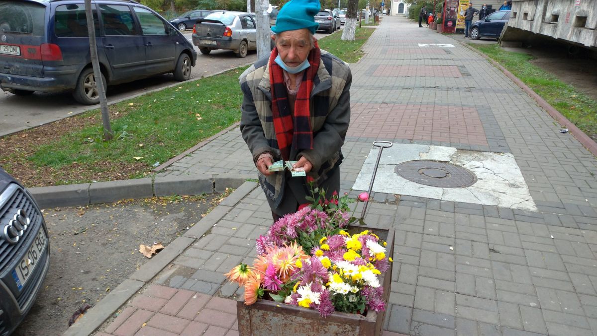 ”Mi-a dat voie să-l fotografiez, n-a vrut să-mi spună cum îl cheamă, mi-a spus însă câți ani are, e cu 2 ani mai mare decât Joe Biden, adică are 79 de ani. L-am întrebat dacă se teme de covid. Mi-a arătat mândru masca. Când l-am întrebat ce pensie are, a dat din umeri - nu știa. L-am întrebat despre copii, a gâgâit trist cu gura fără dinți. Când am cumpărat o floare a zis că i-am dat prea mult”,