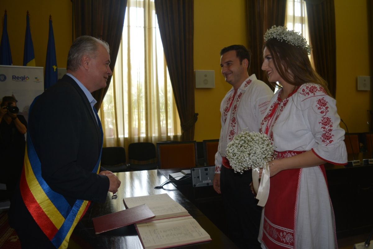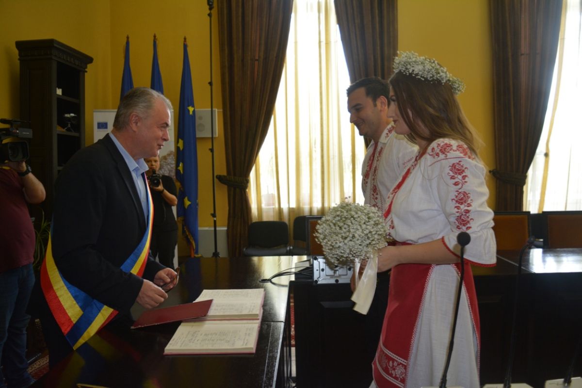 Când le-a înmânat certificatul, primarul a vorbit preț de câteva secunde, urându-le tinerilor să îl păstreze până la sfârșitul vieții.