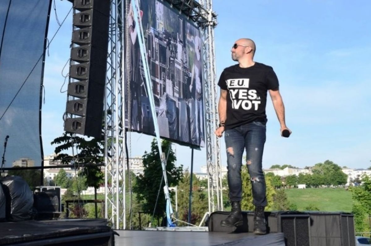 Fostul performer de la emisiunea ”Vocea României” de la Pro Tv a dat semne încă de la concertul susținut la deschiderea Parcului Cornișa că ar cocheta cu politica, atunci susținându-și recitalul într-un tricou cu inscripția ”Yes la vot”.