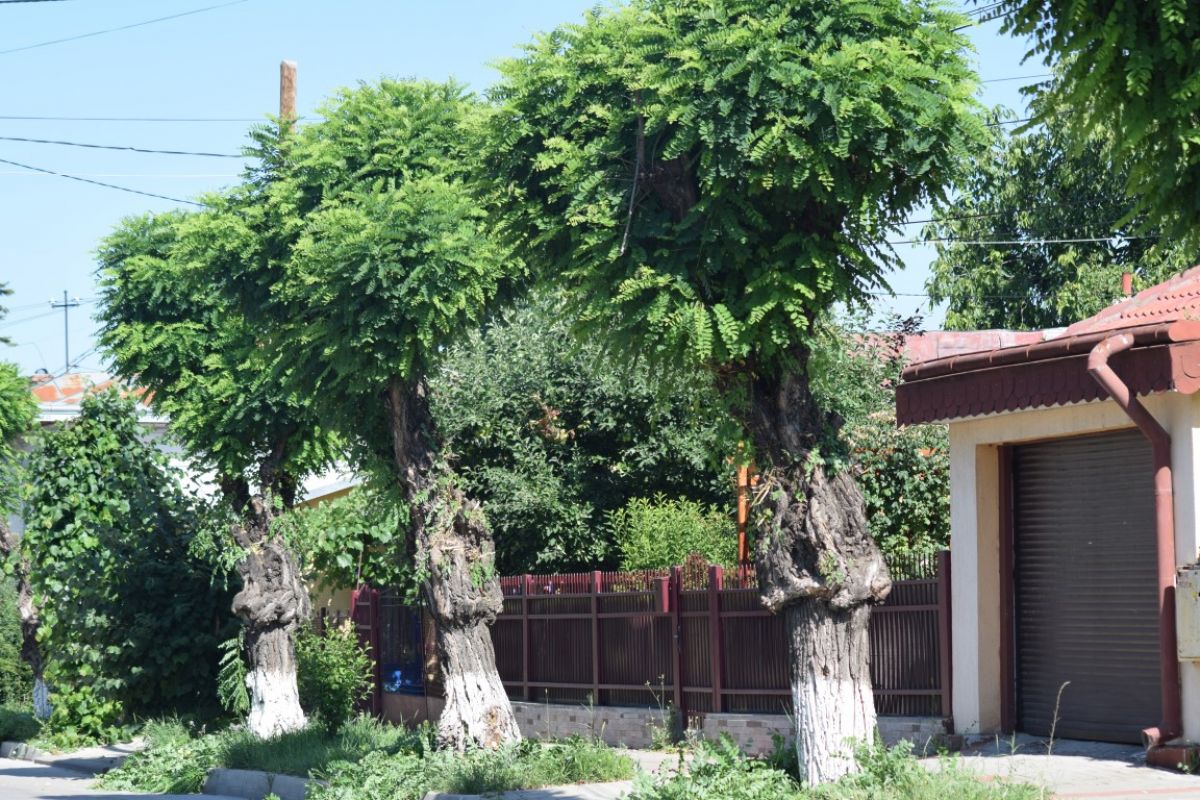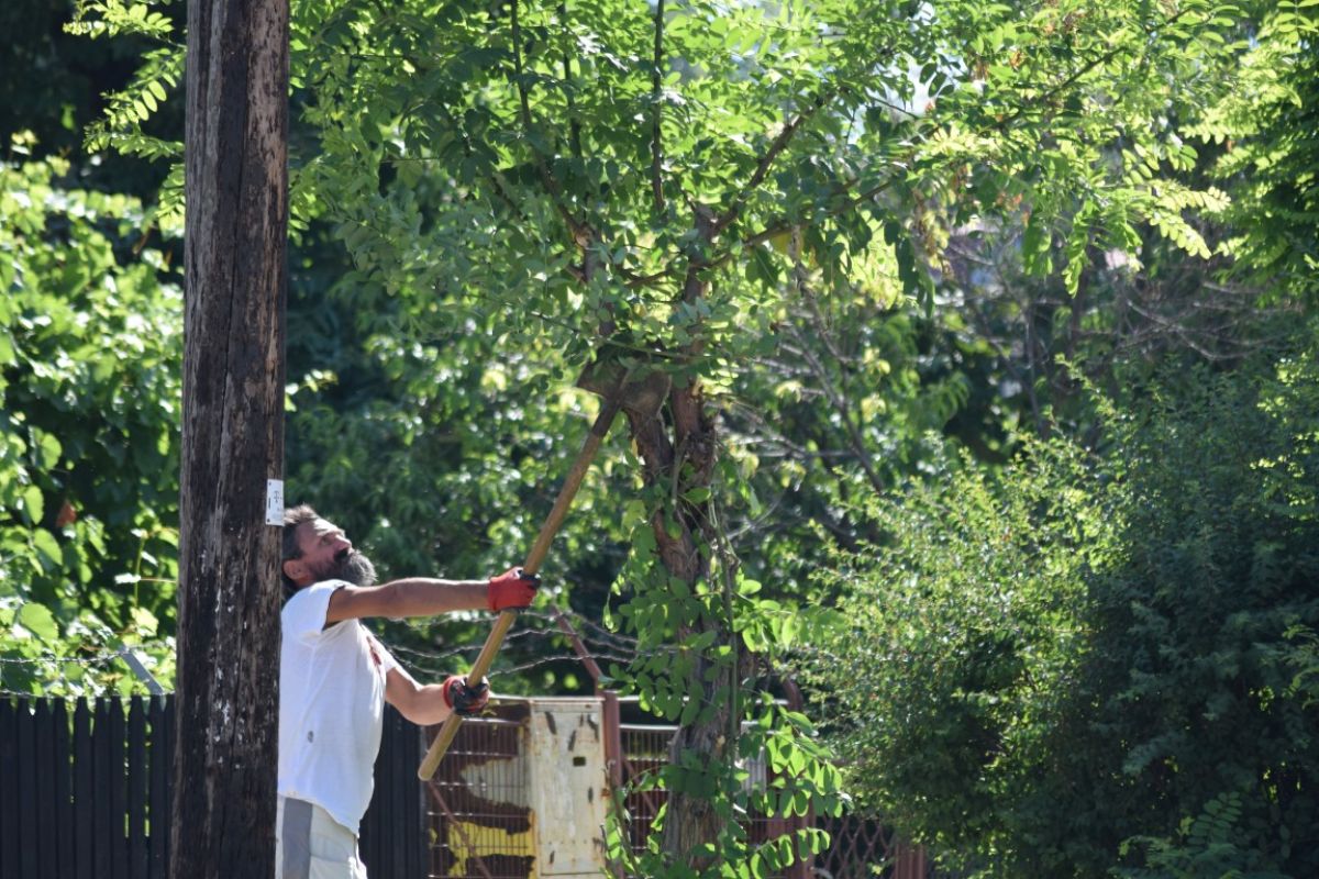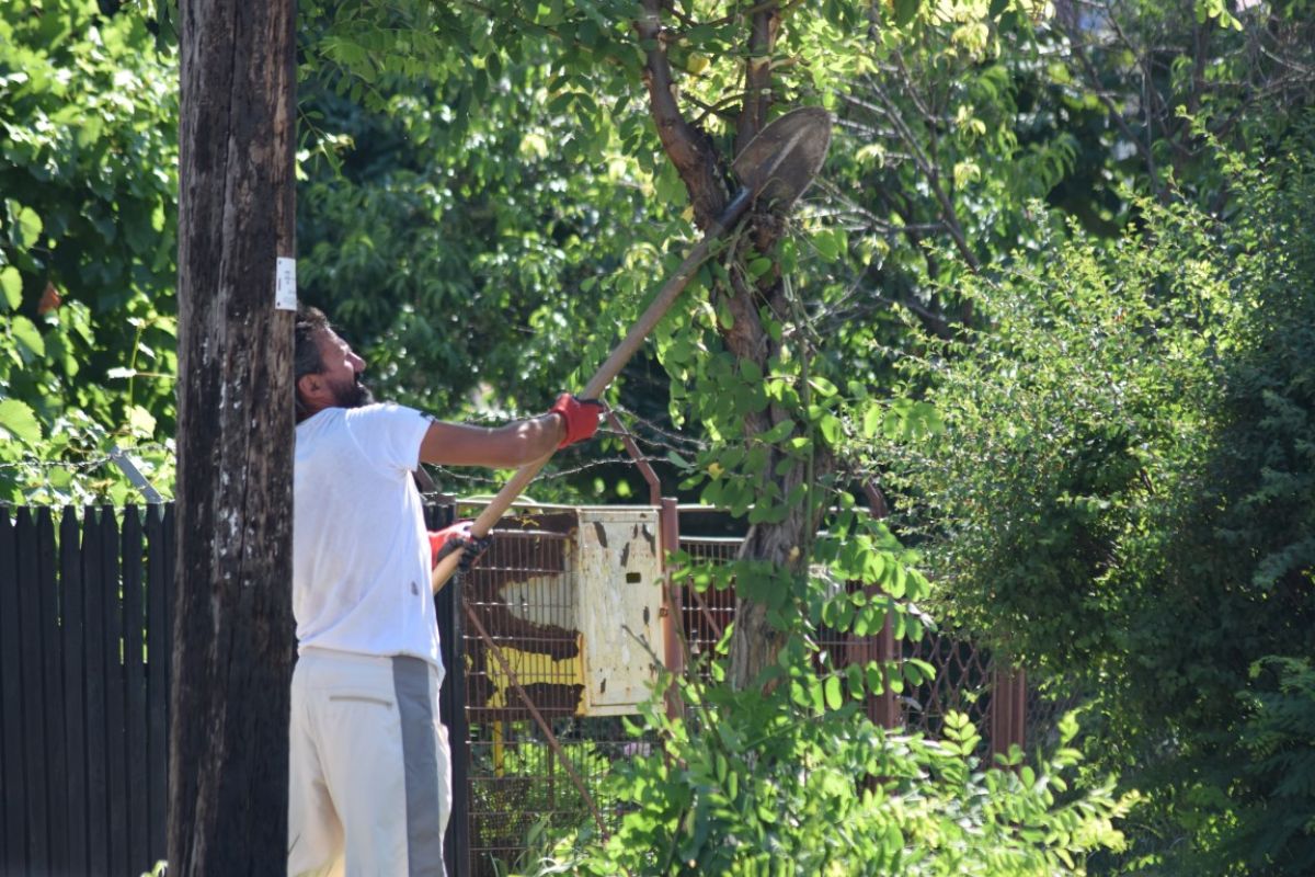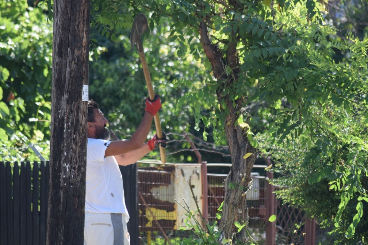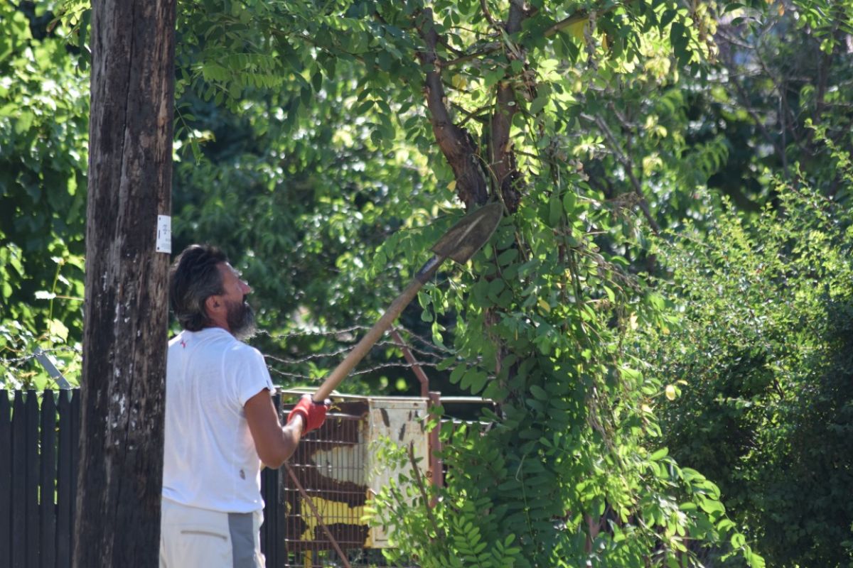 Bărbatul izbea efectiv în copaci cu unealta de lucru, fără să se sinchisească de trecători sau oamenii care locuiesc în zonă.