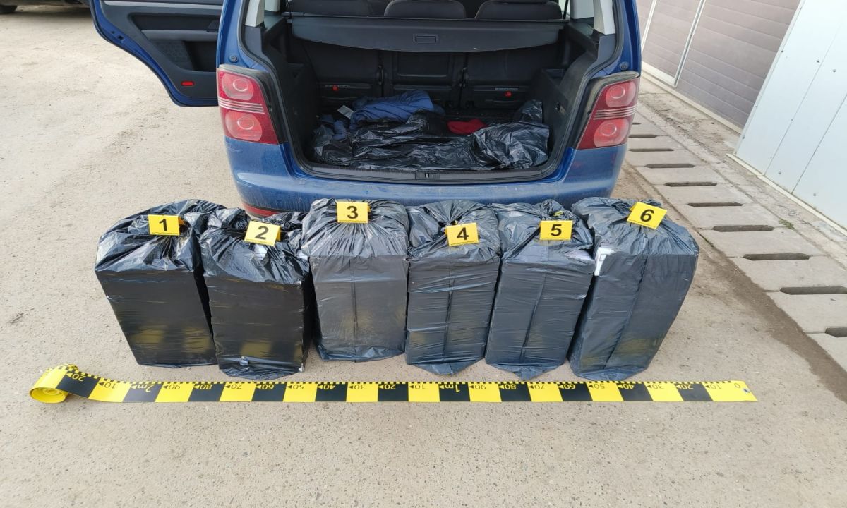 La controlul efectuat asupra autoturismului, a fost descoperită, în portbagaj, cantitatea de 60.000 de țigarete, ambalate în folie neagră.