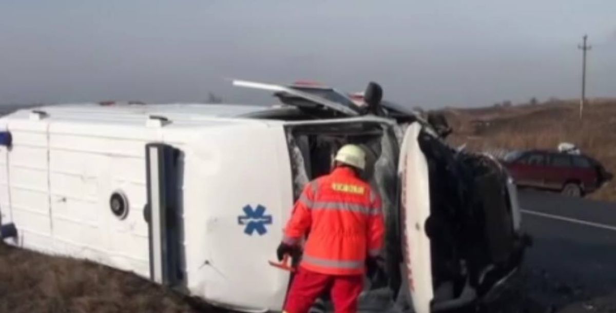 O ambulanță care mergea să preia un pacient s-a răsturnat, după ce a fost lovită de un autoturism, condus de un șofer băut, alte patru mașini și un TIR s-au ciocnit imediat după.