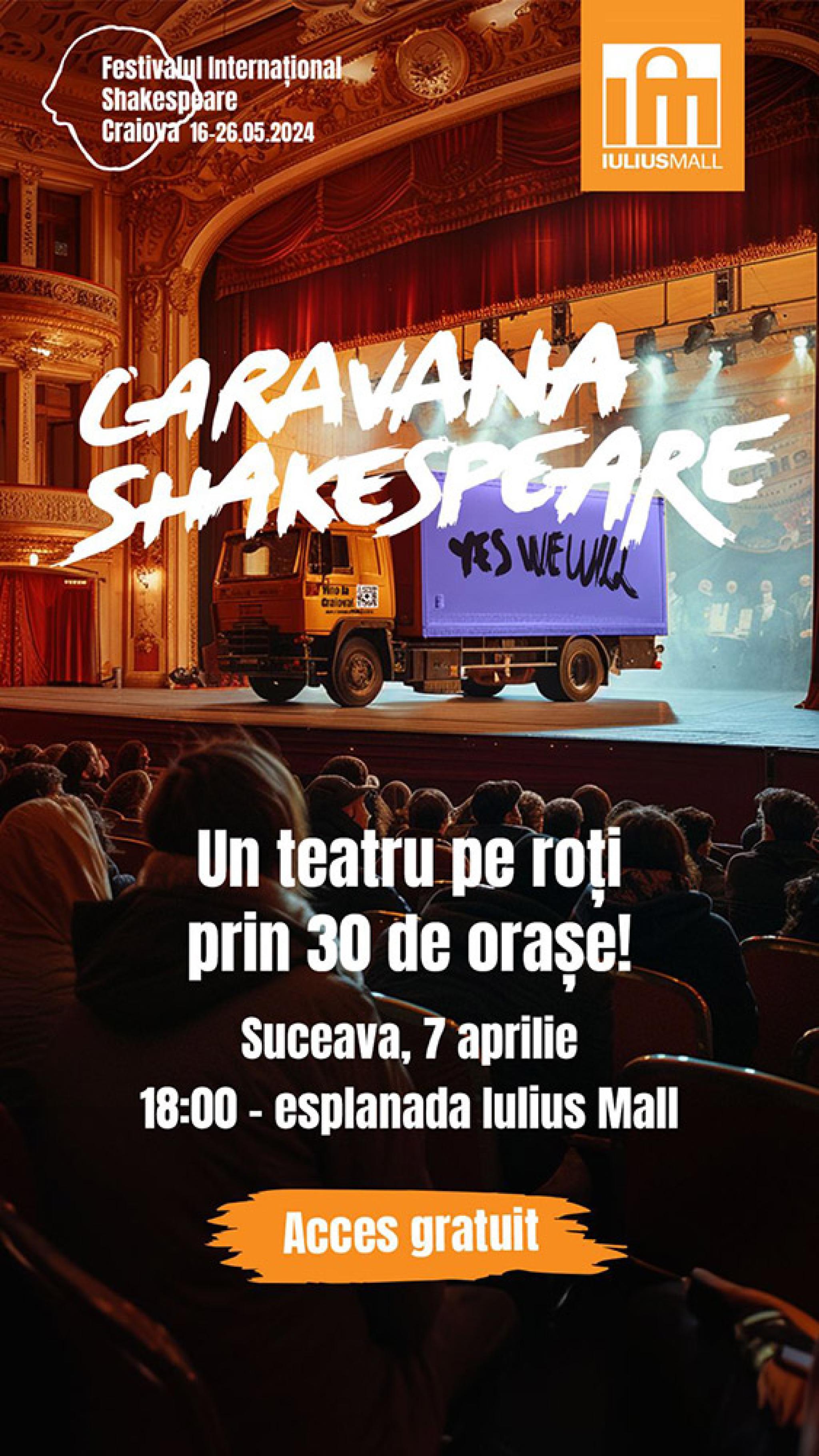 Participanții la spectacolul „Operele complete ale lui Shakespeare” prezentat de Caravana Shakespeare pe Esplanada din fața Iulius Mall Suceava se vor putea înscrie în concursul care le poate aduce unul dintre cele două weekend-uri în doi (cazare, transport, bilete la spectacole), la Festivalul Internațional Shakespeare, de la Craiova.
