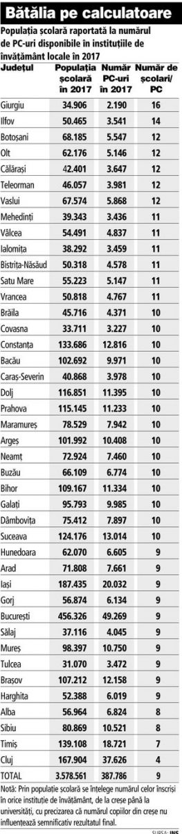 Calculele Ziarului Financiar făcute pe baza informaţiilor INS arată că în Giurgiu, Botoşani, Teleorman sau Vaslui un calculator este utilizat în medie de câte 12-16 copii, acestea fiind de altfel şi printre cele mai sărace zone ale României.