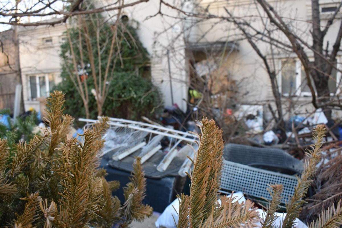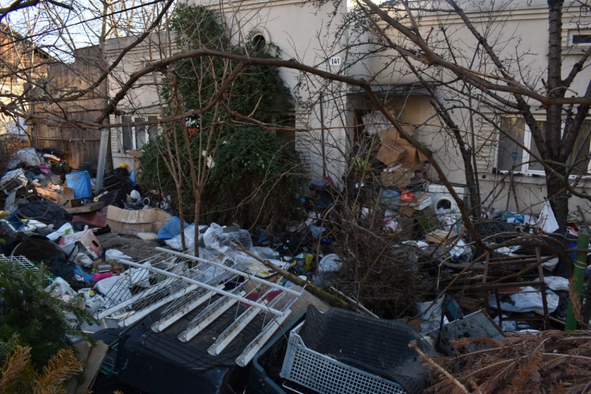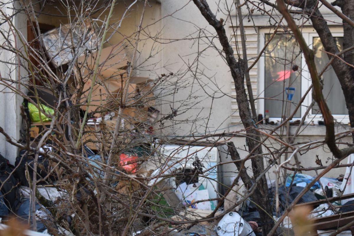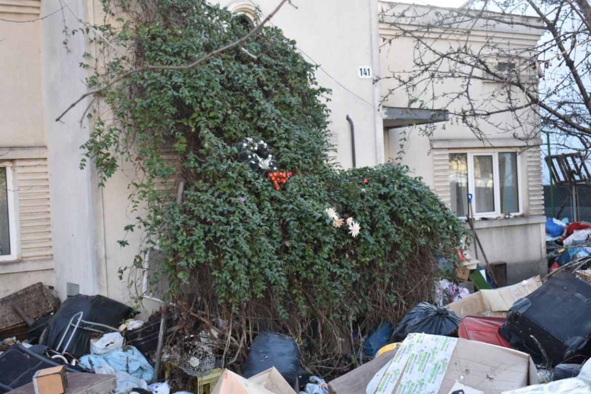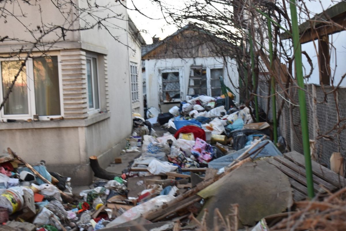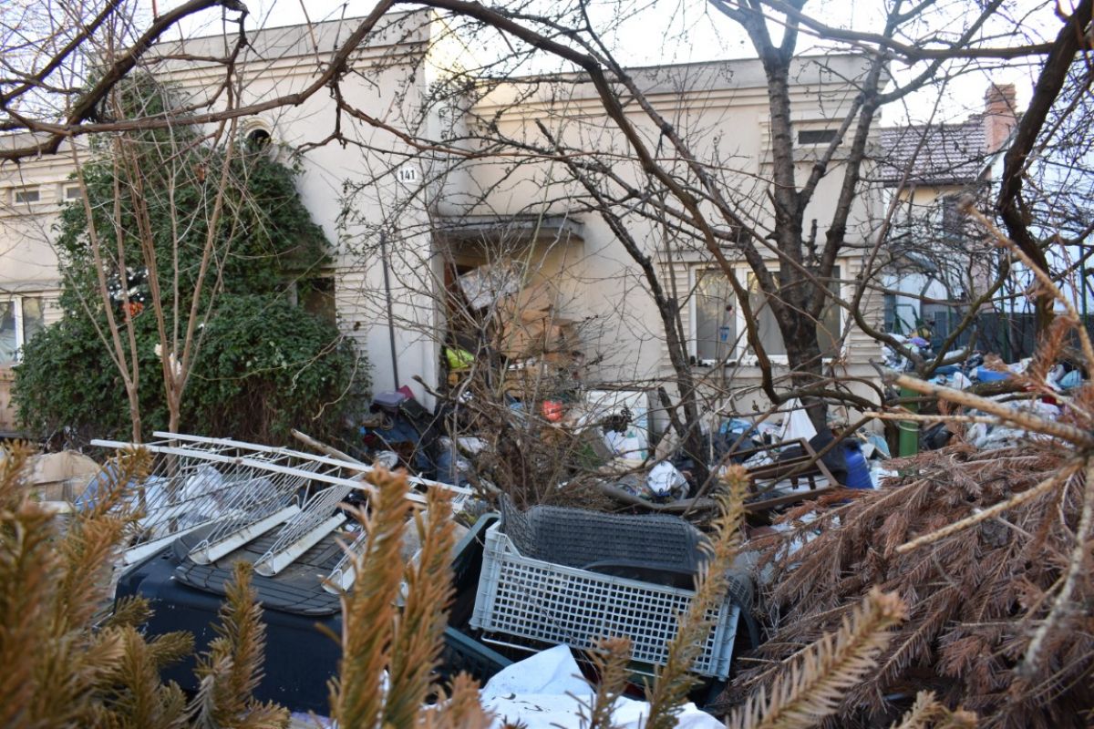 Din stradă accesul la casă pare aproape imposibil, mai ales că și ușa de la intrare este acoperită cu tot felul de gunoaie.