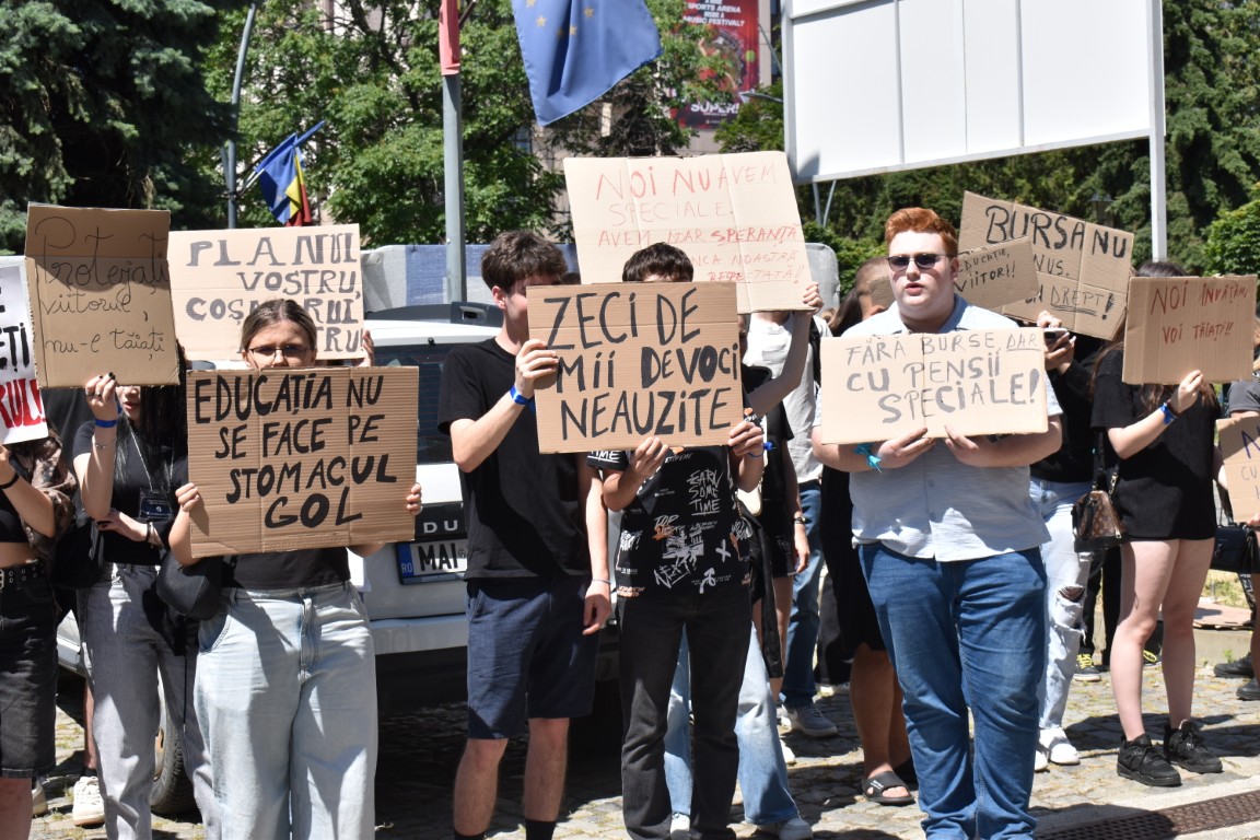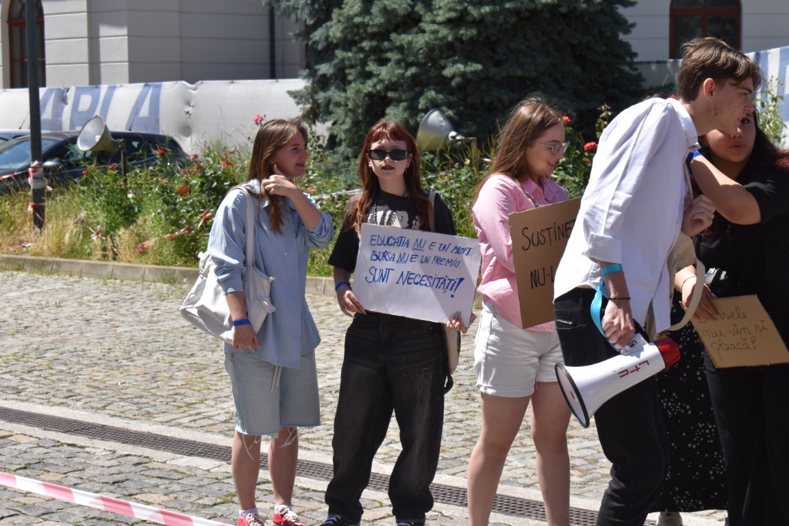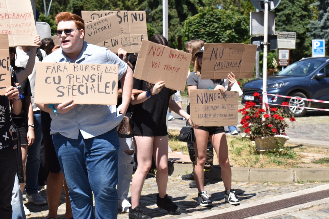 Au avut și pancarte cu mesaje adresate celor de la București care, în planurile de reducere a cheltuielilor au decis să includă și bursele elevilor.
