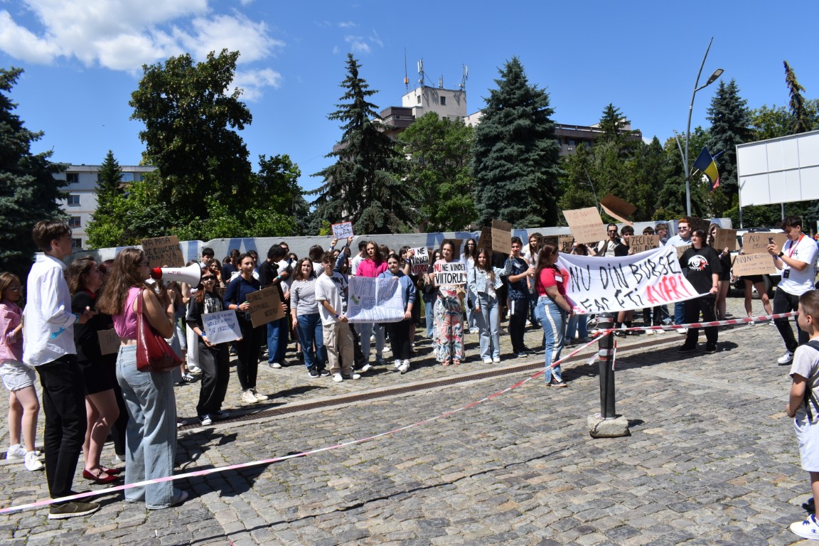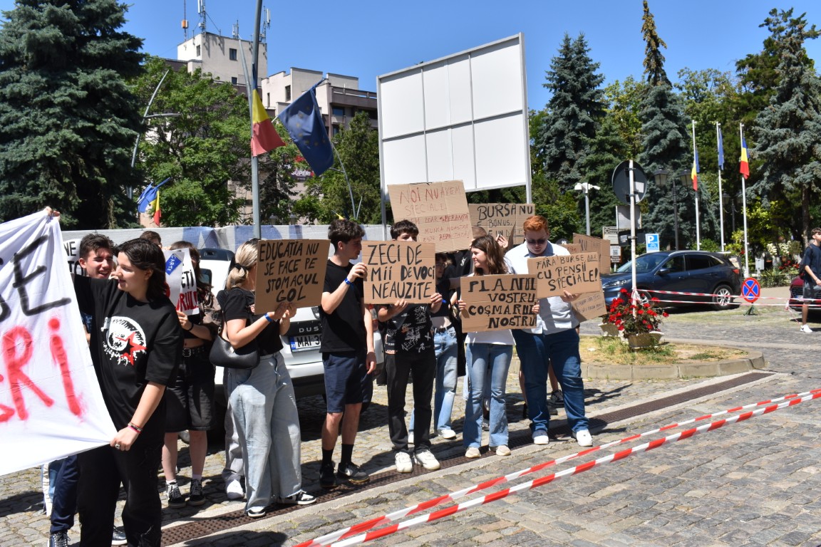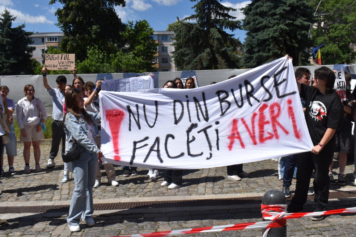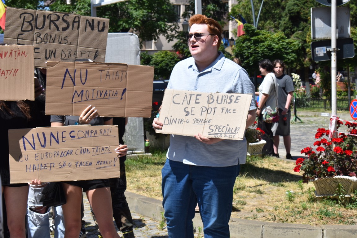 Au avut și pancarte cu mesaje adresate celor de la București care, în planurile de reducere a cheltuielilor au decis să includă și bursele elevilor.