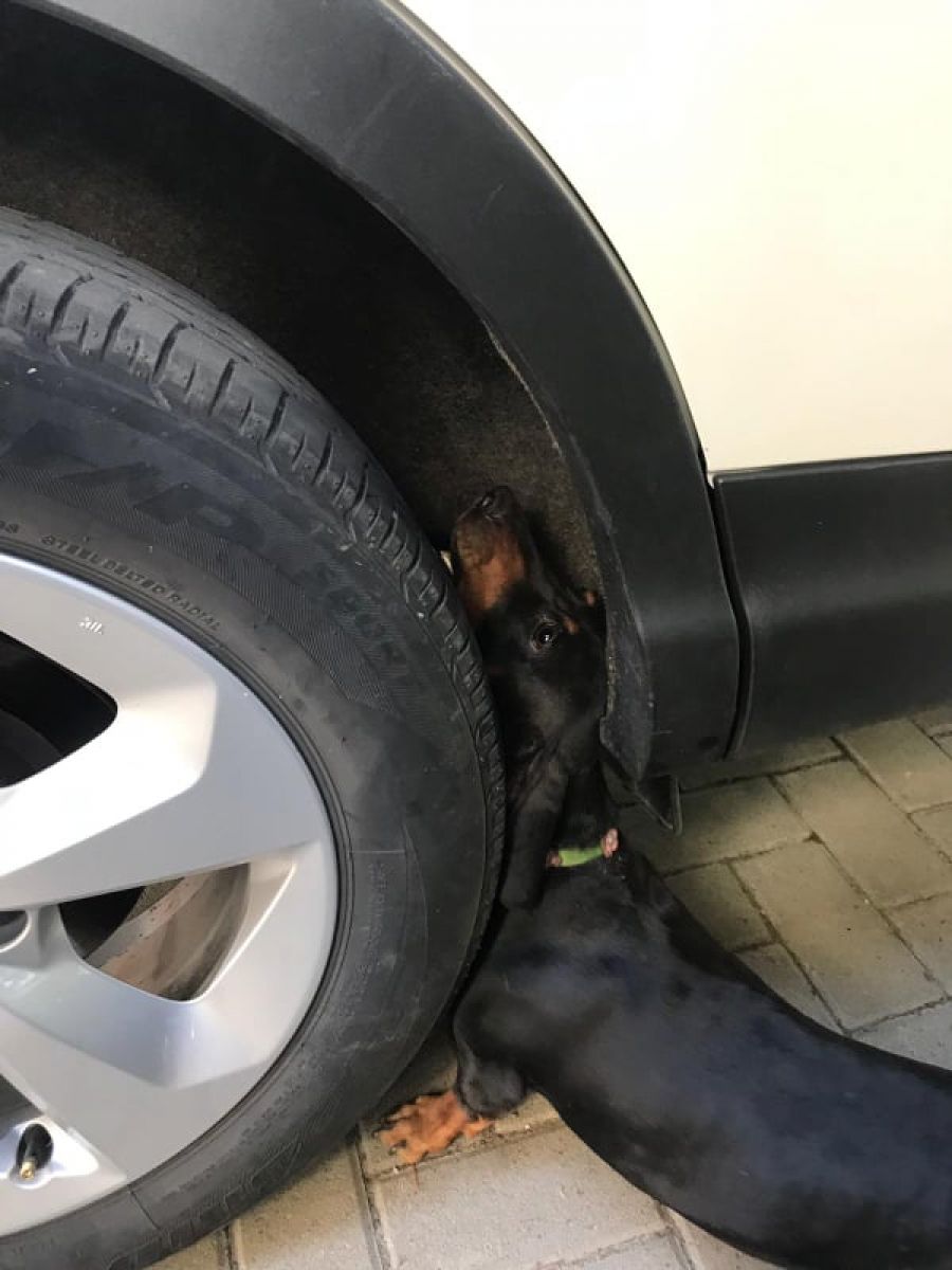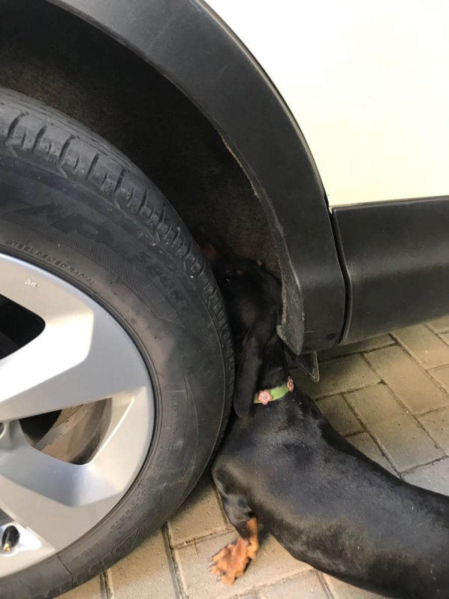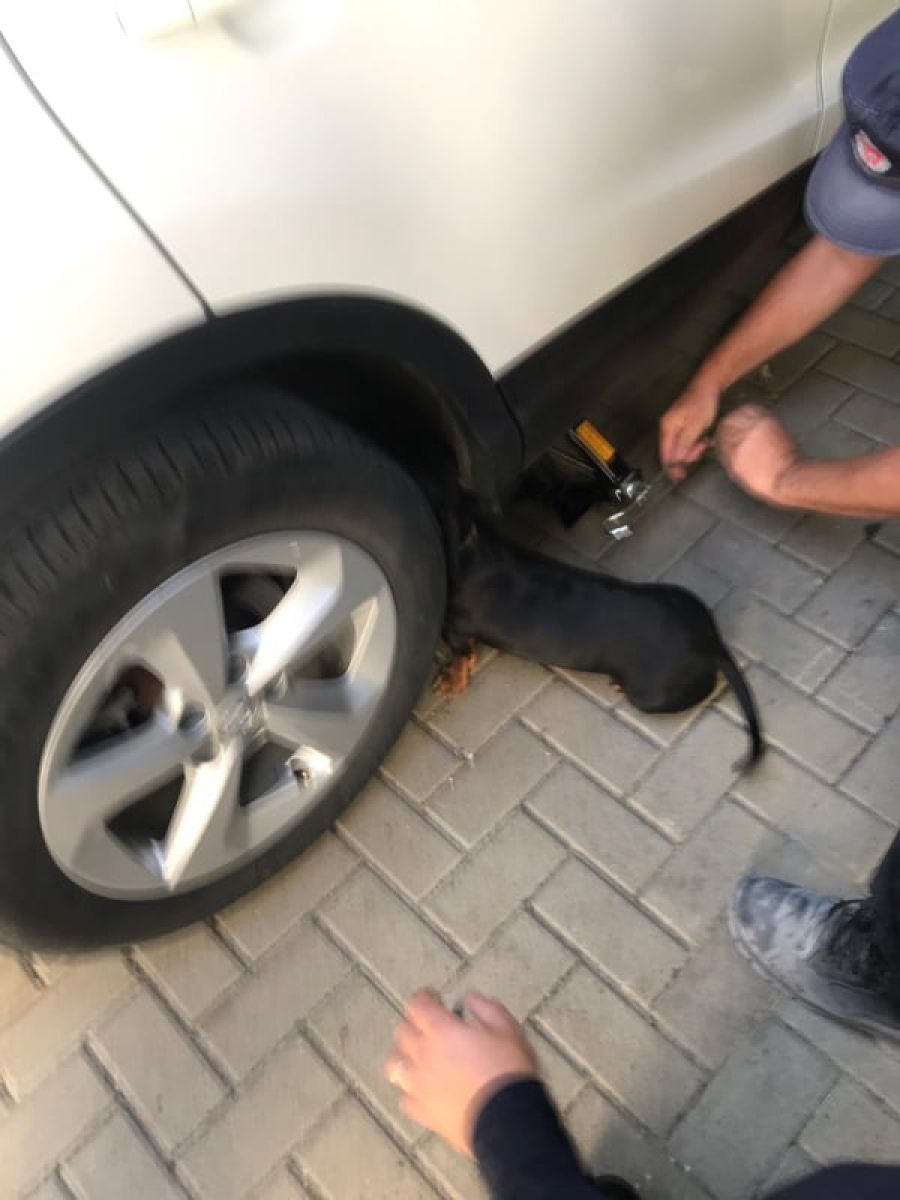 Pompierii dorohoieni au intervenit pentru salvarea unui cățel blocat între roata și caroseria unui autoturism parcat.