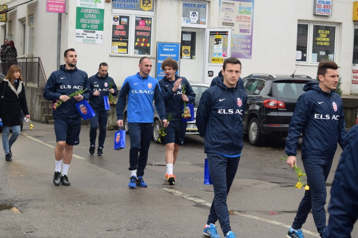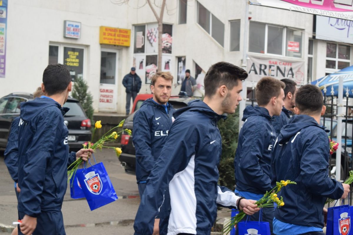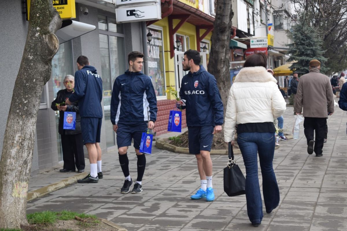 Fotbaliștii cu buchețele de frezii în mâini au intrat în magazine, au oprit mașini sau au urcat în tramvai pentru a le spune reprezentantelor sexului frumos ”La mulți ani” de Ziua Internațională a Femeii.