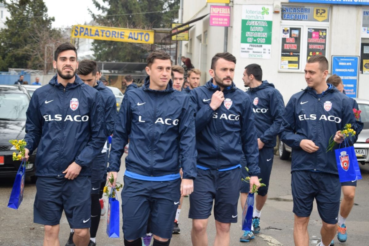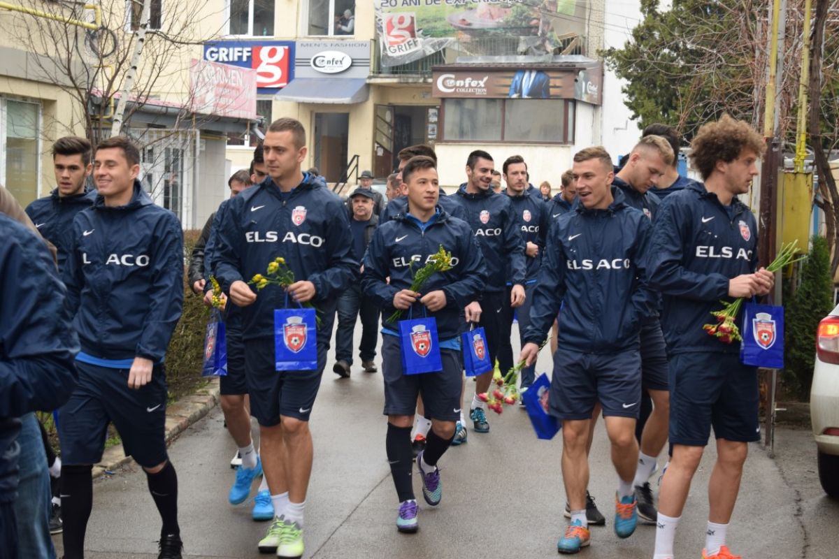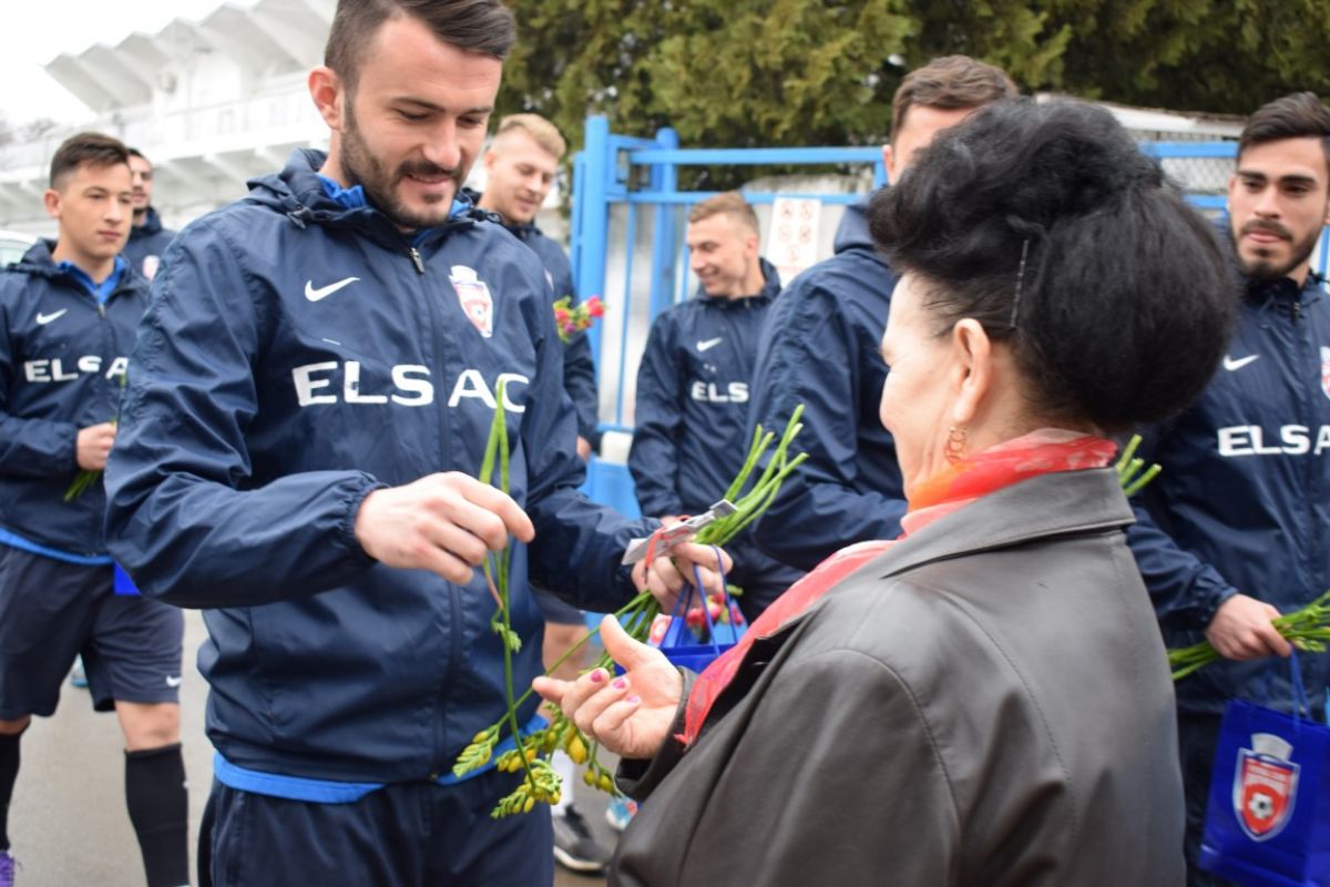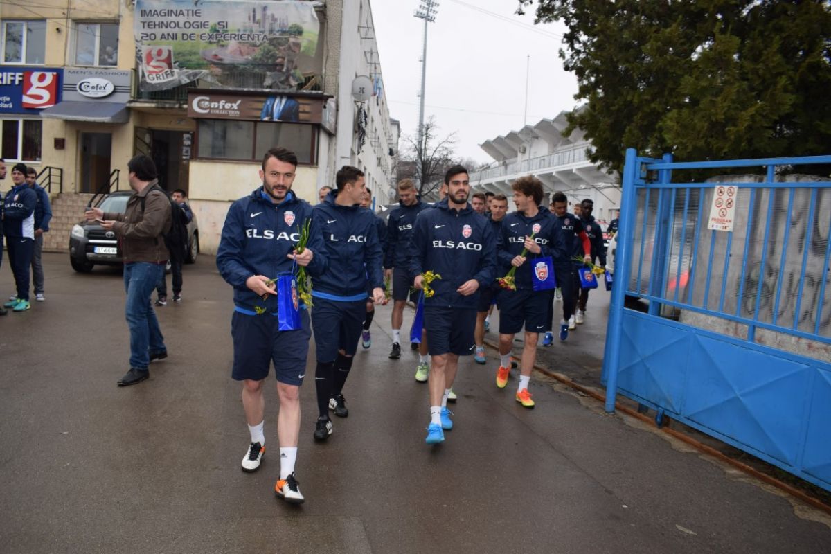 Fotbaliștii cu buchețele de frezii în mâini au intrat în magazine, au oprit mașini sau au urcat în tramvai pentru a le spune reprezentantelor sexului frumos ”La mulți ani” de Ziua Internațională a Femeii.