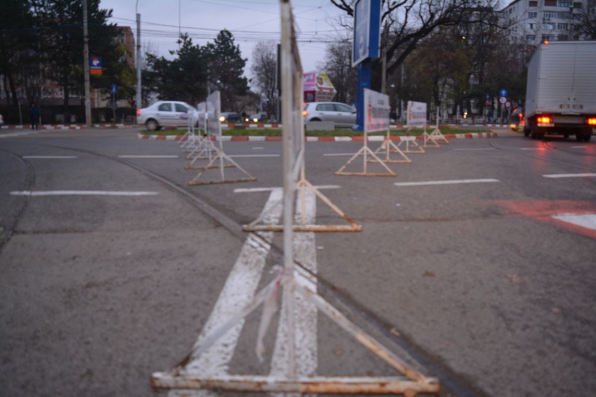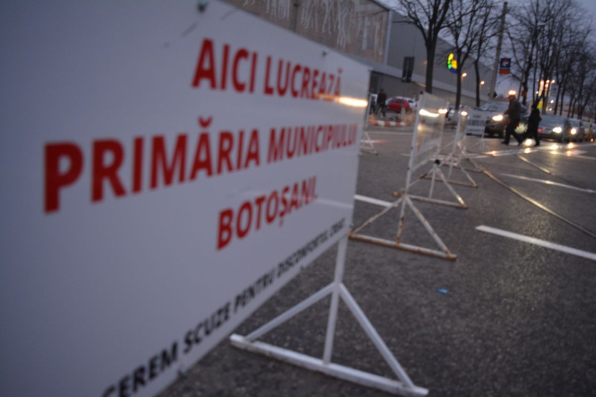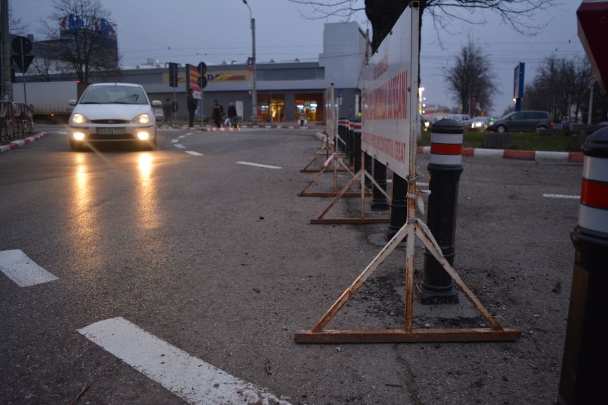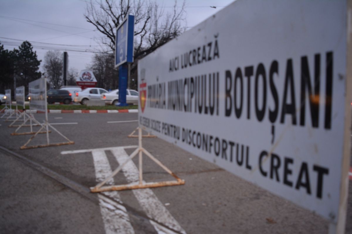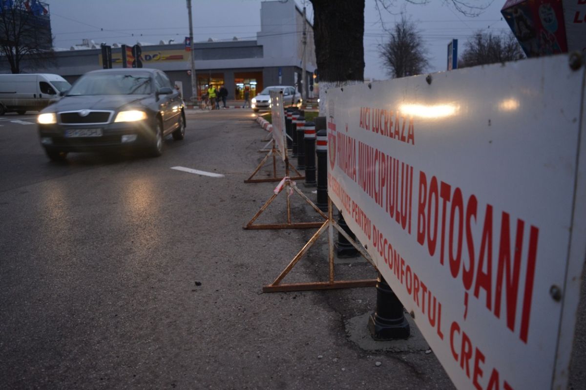 Panouri cu inscripţia „Aici lucrează Primăria municipiului Botoşani” şi piloni de plastic plantaţi direct în carosabil, de asta au avut parte joi conducătorii auto care au ajuns în intersecţia de la Botoşani Shopping Center.