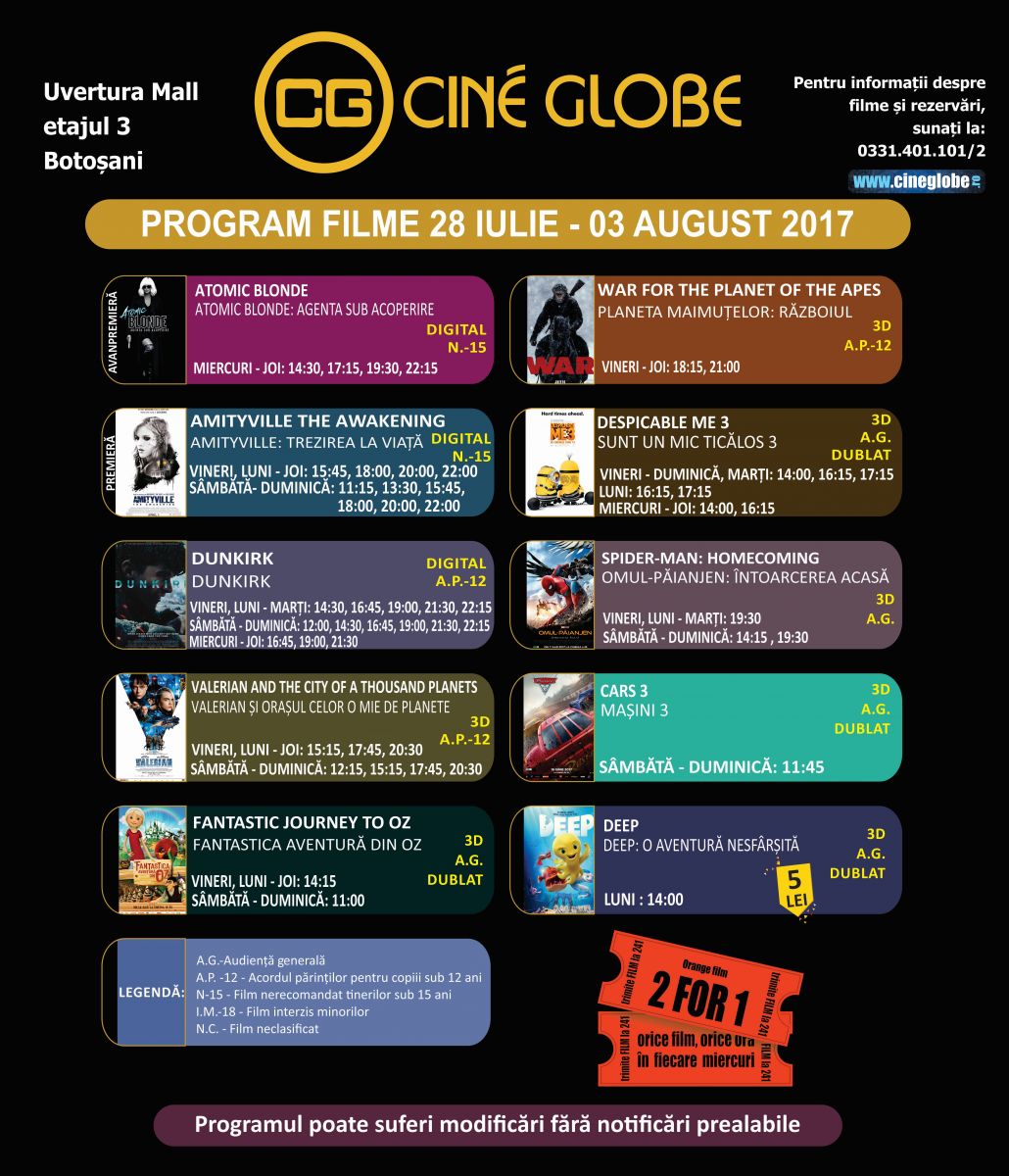 Botoșănenii iubitori de film se pot delecta în perioada 28 iulie – 3 august la Cine Globe, din incinta Uvertura Mall, cu noi pelicule pline de suspans şi aventură, care vor fi proiectate în avanpremieră.