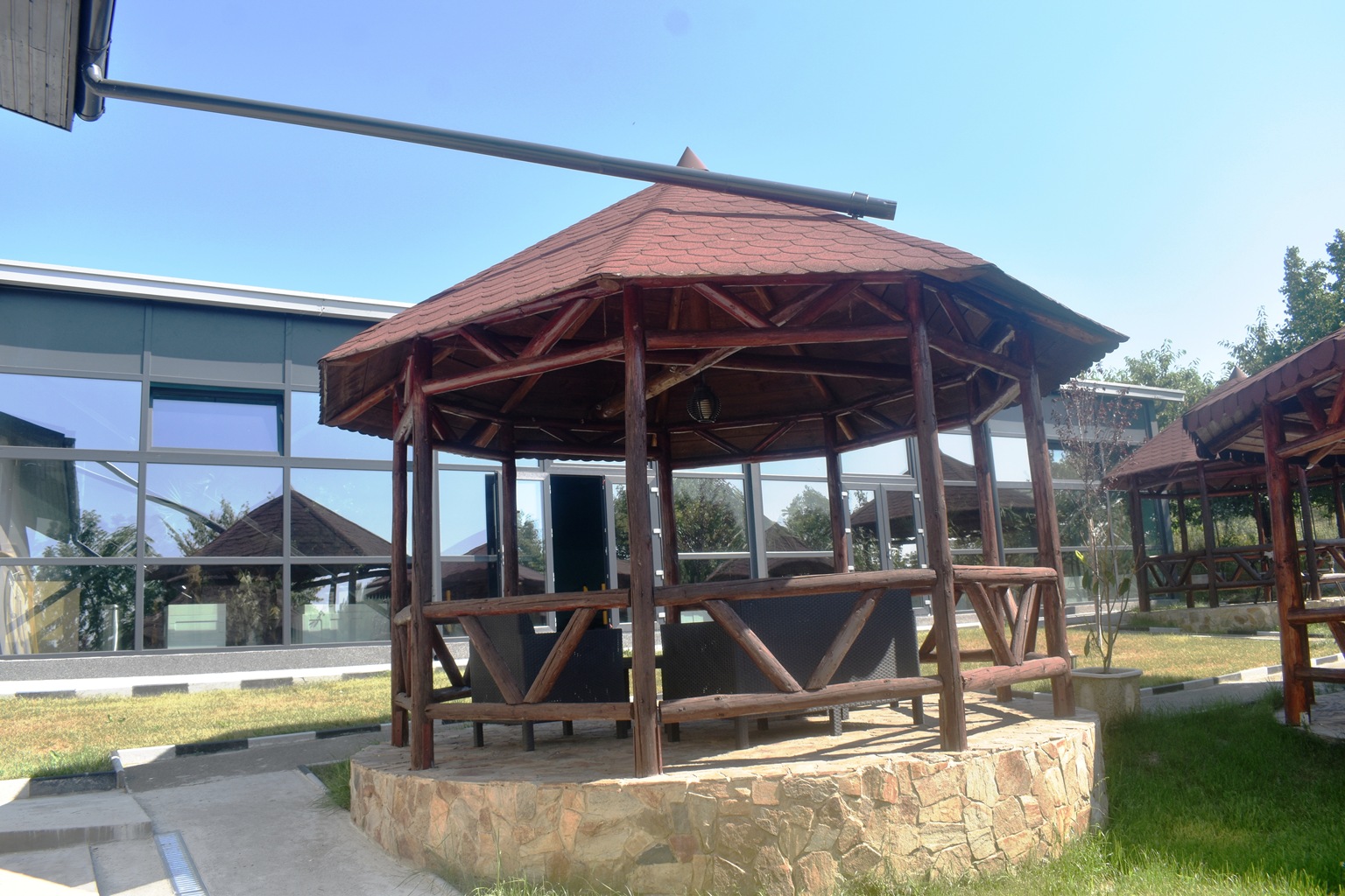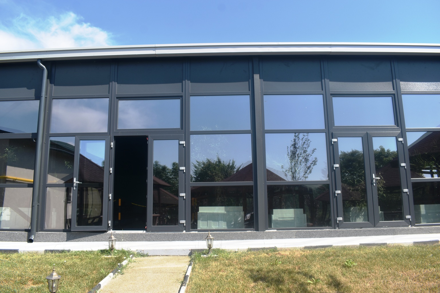 Unul dintre pereți este de sticlă, asigură iluminarea naturală și oferă ieșire spre o grădină cu teren de sport și foișoare.