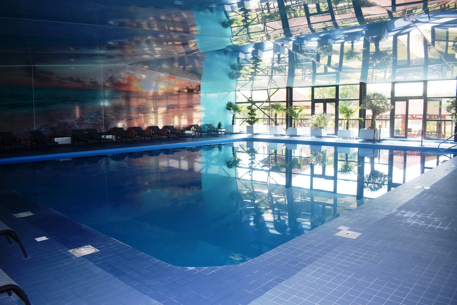 Are toate dotările necesare ca să asigure câteva ore de destindere, de la vestiare și toalete moderne la șezlonguri și automat cu băuturi.