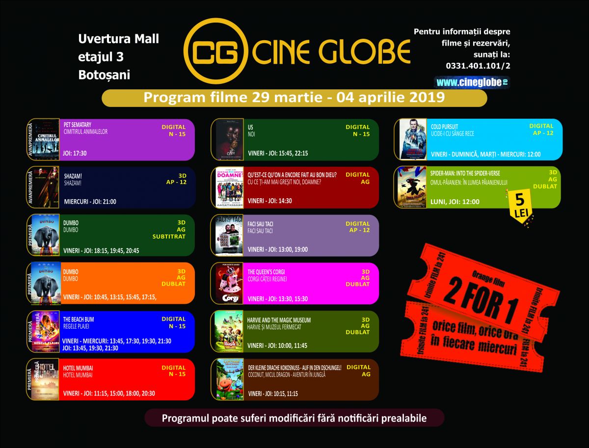 Reprezentanții Cine Globe aflat în incinta Uvertura Mall au transmis joi programul de difuzare pentru săptămâna 29 martie – 4 aprilie 2019.
