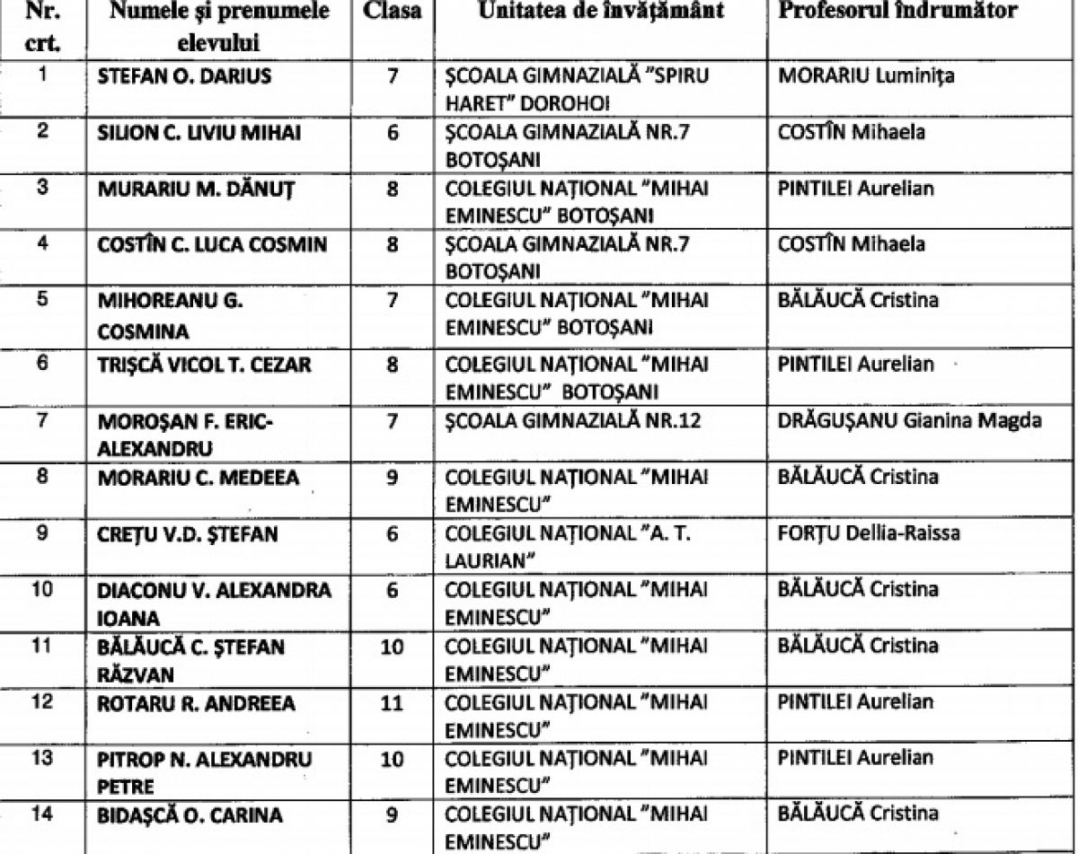 Potrivit comunicatul de presă trimis redacției de Inspectoratul Școlar Județean Botoșani (IȘJ), s-au obținut 14 premii I, șapte premii II, opt premii III și 19 mențiuni. Județului Botoșani i-au fost repartizate un număr de 14 locuri pentru etapa națională, care se va desfășura la Timișoara, județul Timiș în perioada 15-20 aprilie 2016. Elevii calificați pentru etapa națională a Olimpiadei de Fizică sunt: