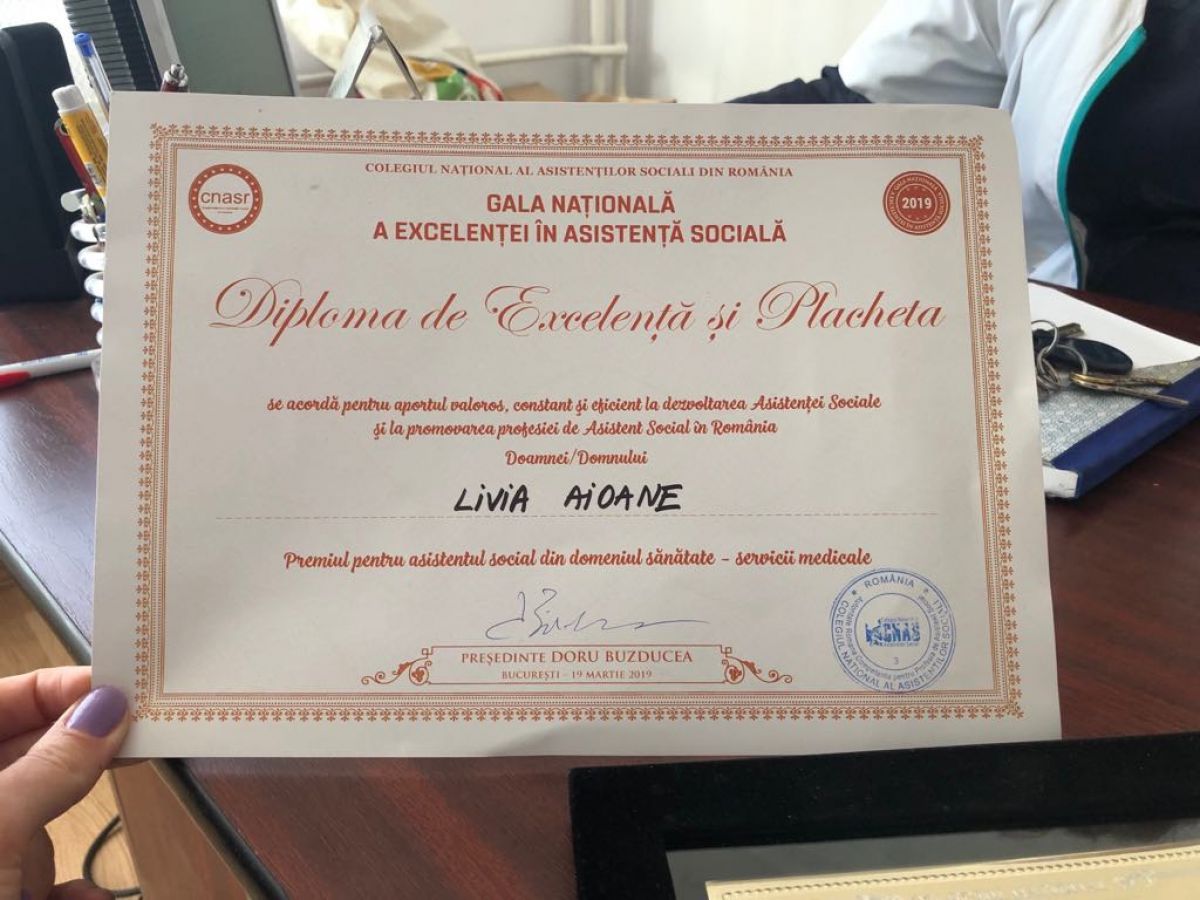 Este vorba despre Livia Aioane, asistent social la Secția de Psihiatrie Spitalului Județean de Urgență Mavromati, din Botoșani. Această a primit o diplomă și o plachetă în cadrul evenimentului pentru aportul valoros, constant și eficient la dezvoltarea asistenței sociale și pentru promovarea profesiei de asistent social în România.