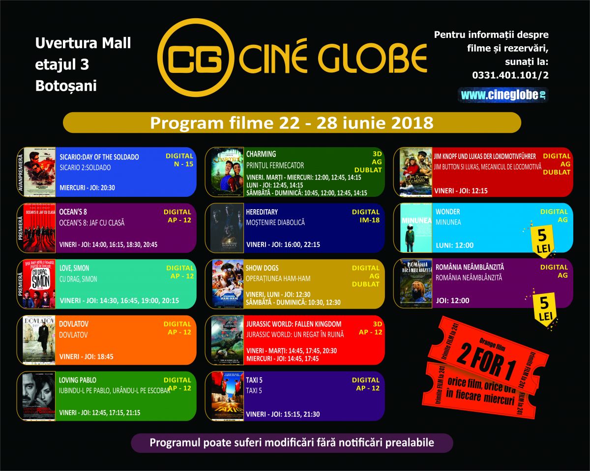 Reprezentanții singurului multiplex de la Botoșani, aflat în incinta Uvertura Mall au transmis programul de difuzare pentru săptămâna 22 – 28 iunie 2018.