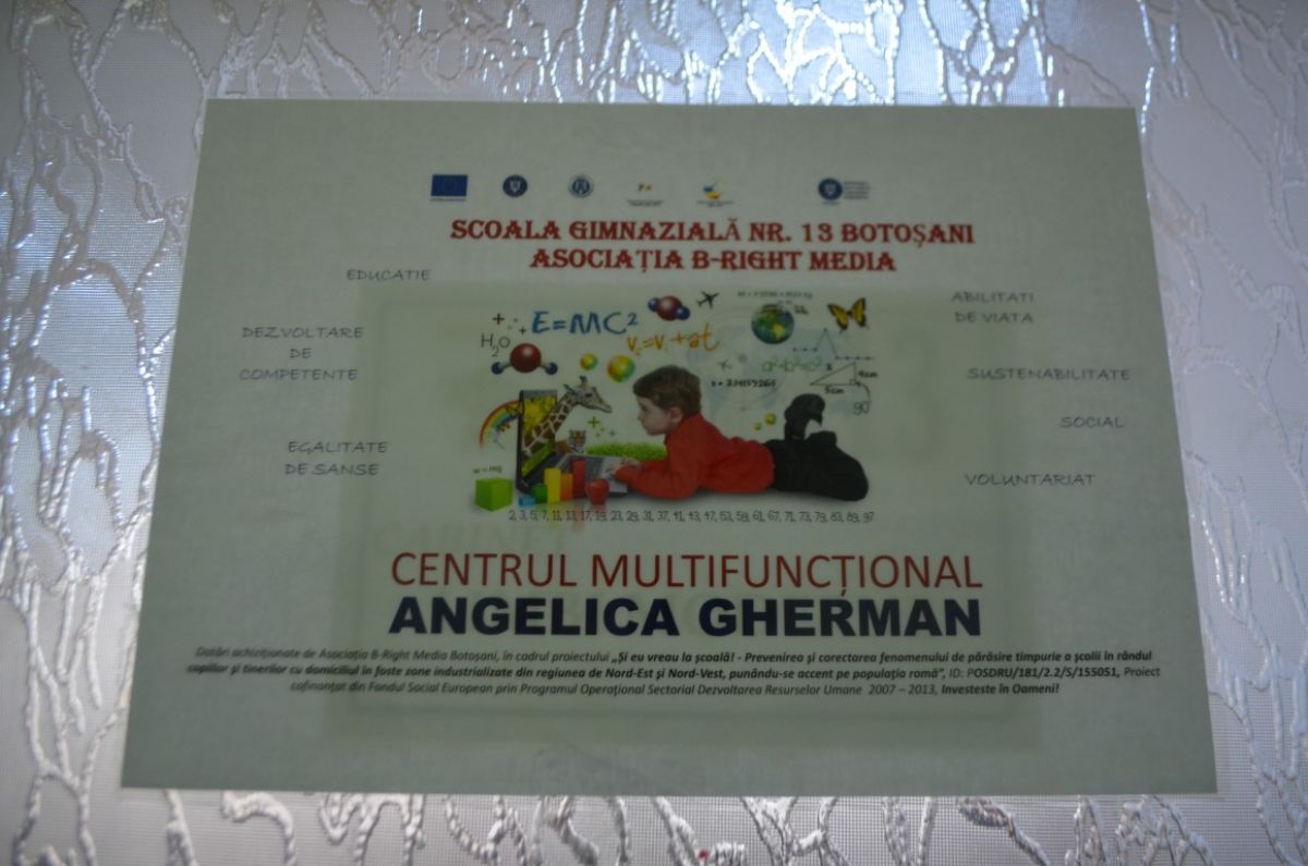 Centrul Multifuncțional Angelica Gherman este proiectul Asociației B-Right Media și este dotat în cadrul proiectului ”Și eu vreau la școală – Prevenirea și corectarea fenomenului de părăsire timpurie a școlii în rândul copiilor și tinerilor cu domiciliul în foste zone industrializate din Regiunea de Nord – Vest și Nord – Est, punându-se accent pe populația romă” – ID – POSDRU /181/2.2/S/155051, proiect finanțat din Fondul Social European prin Programul Operațional Sectorial Dezvoltarea Resurselor Umane 2007 – 2013 – Investește în oameni.