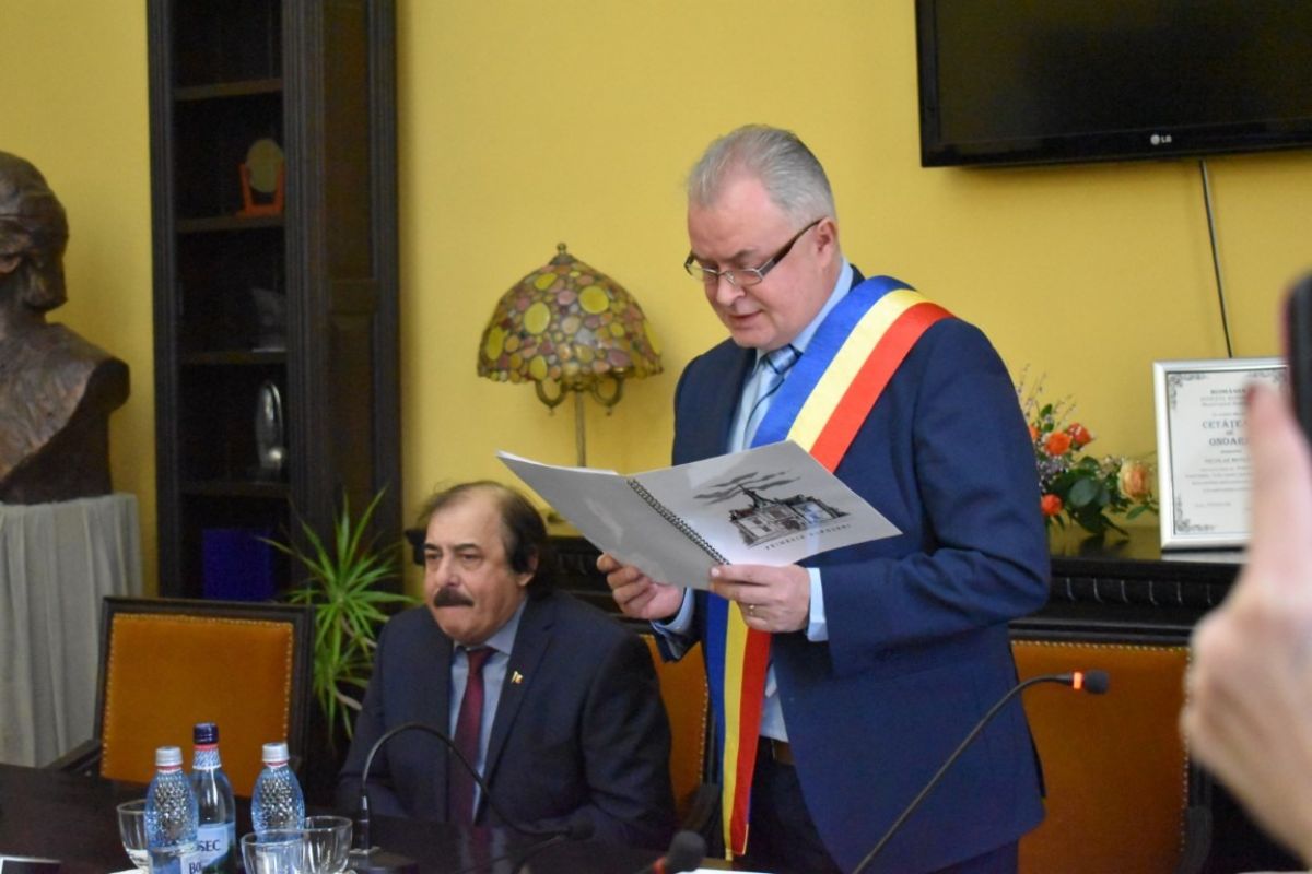 Primarul i-a înmânat placheta și un buchet de flori și l-a îmbrățișat călduros pe maestrul care este considerat o legendă vie.