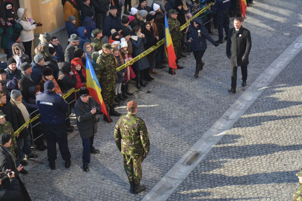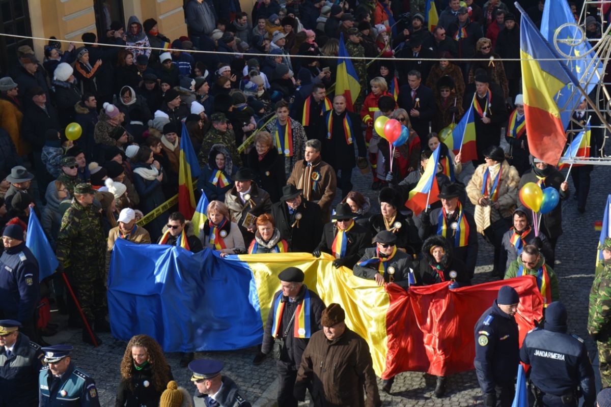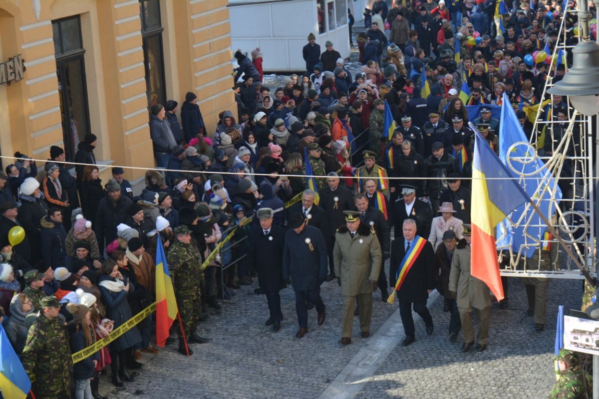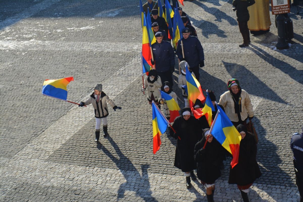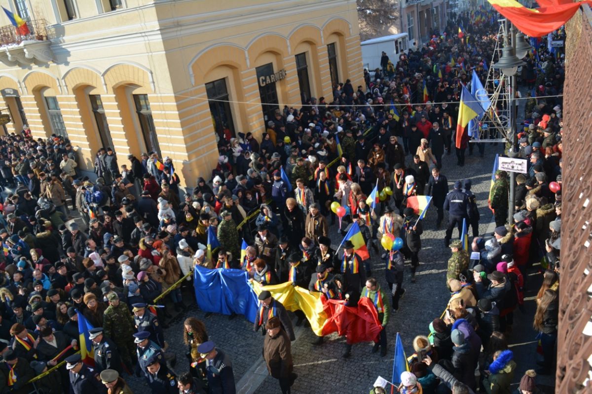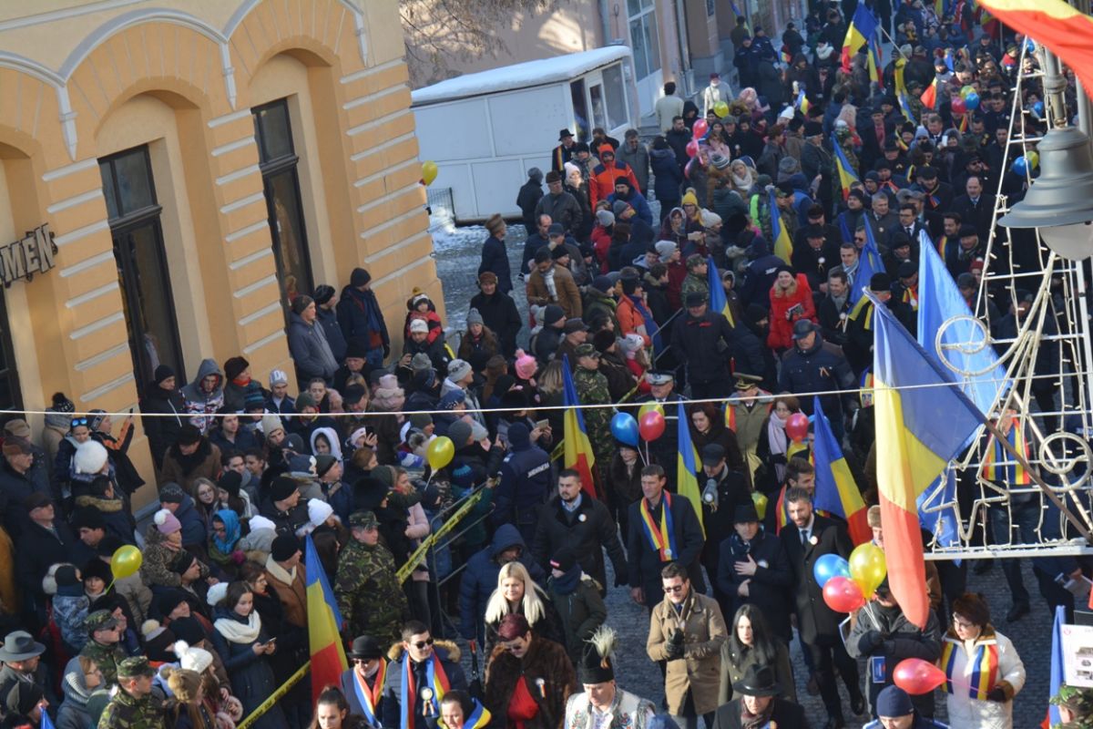 Prefectul Dan Şlincu a primit onorul de la Garda Militară, după care o mulţime de oameni s-a revărsat spre Piaţa 1 Decembrie 1918 agitând sute de drapele naţionale.