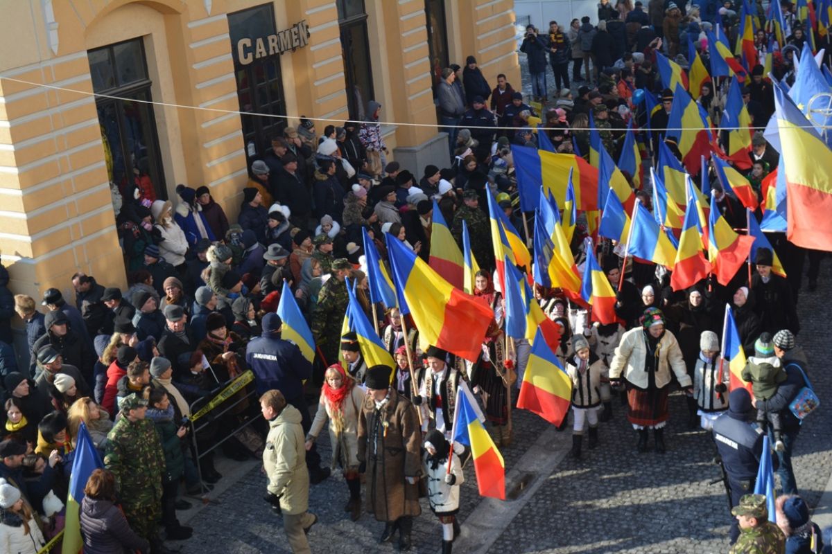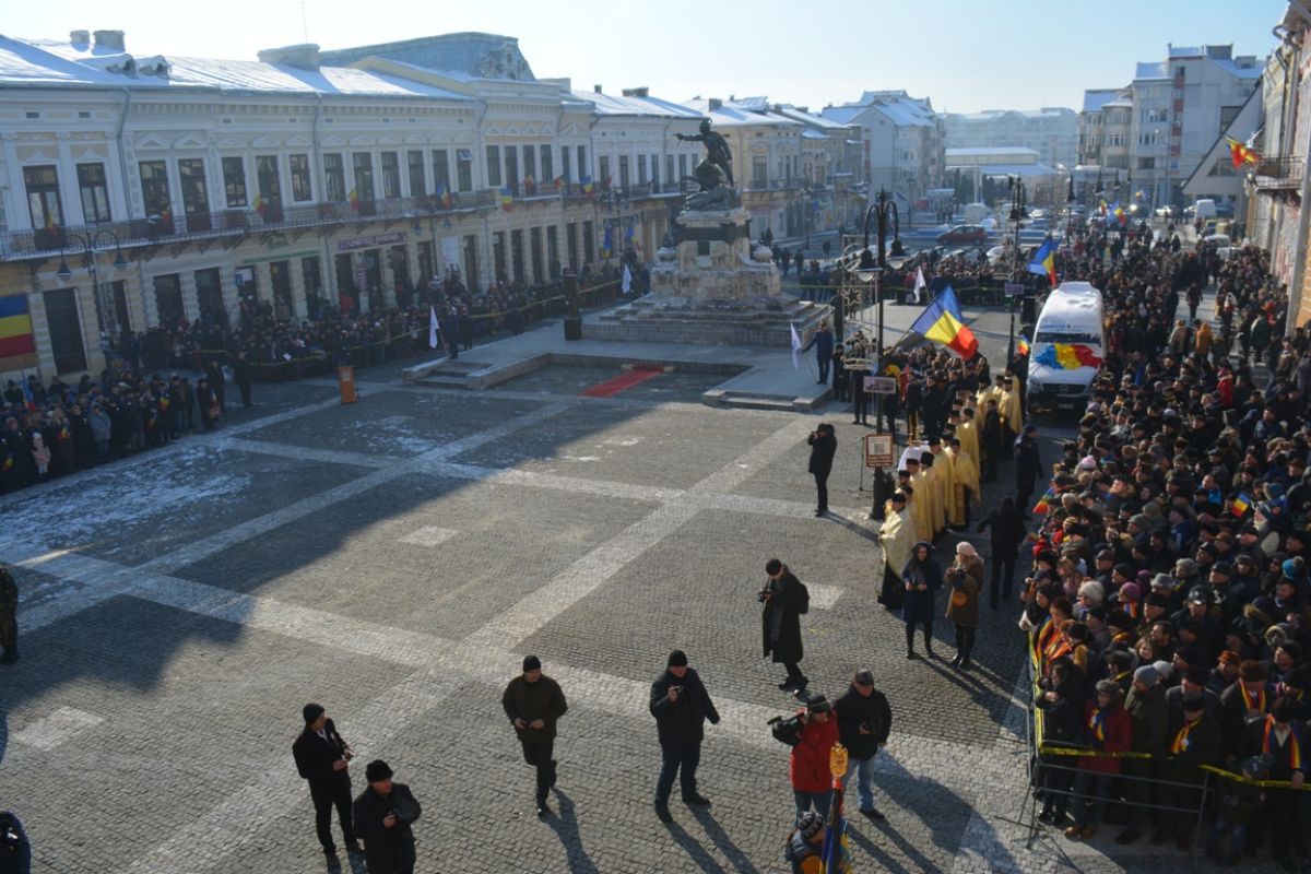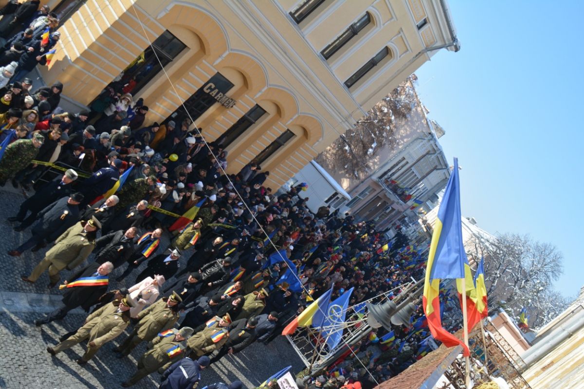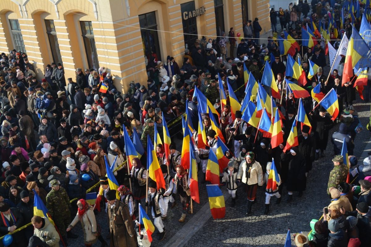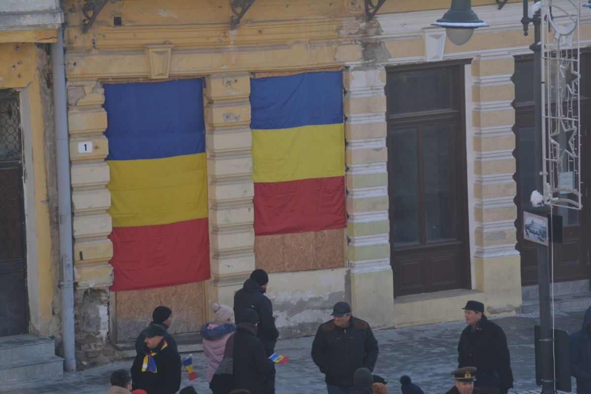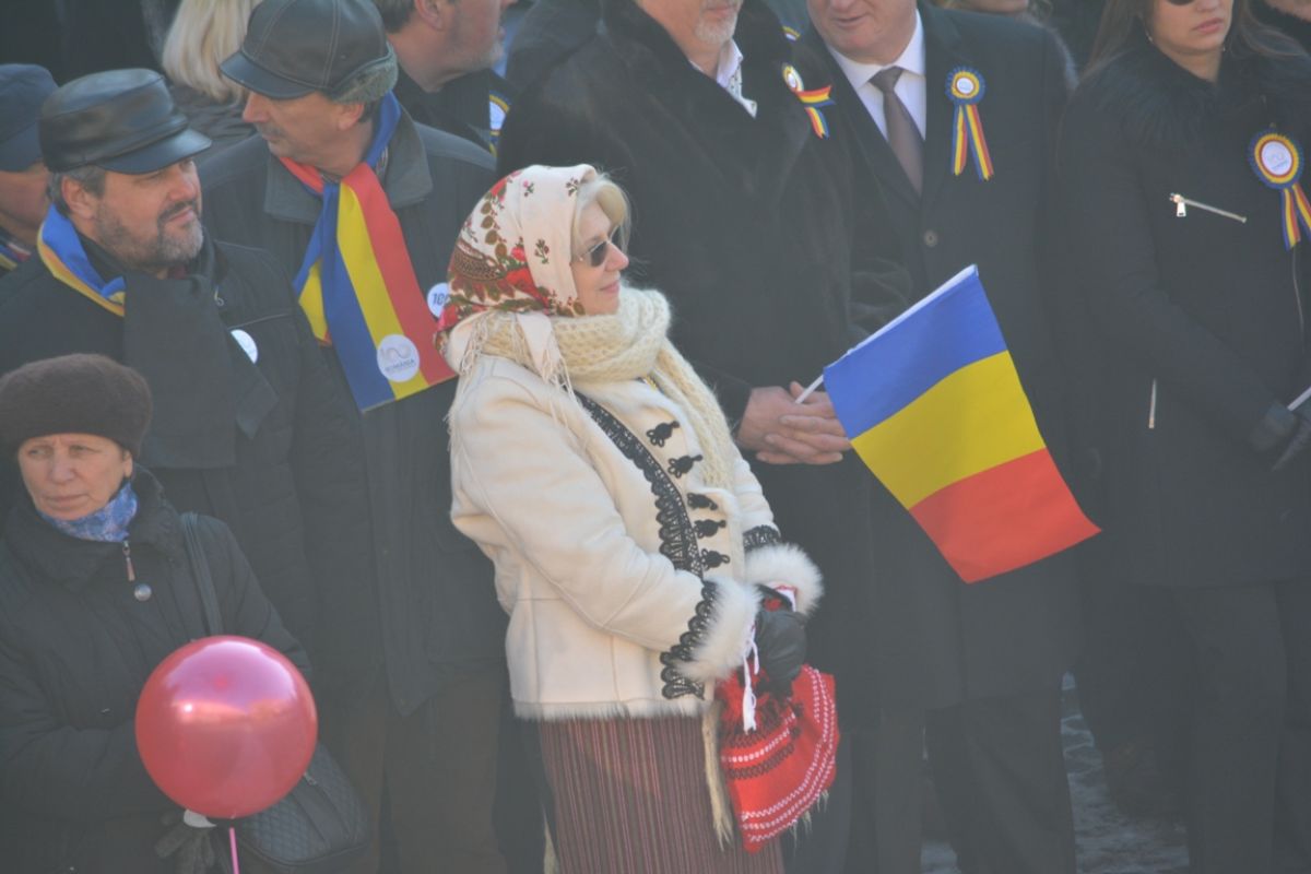 Prefectul Dan Şlincu a primit onorul de la Garda Militară, după care o mulţime de oameni s-a revărsat spre Piaţa 1 Decembrie 1918 agitând sute de drapele naţionale.